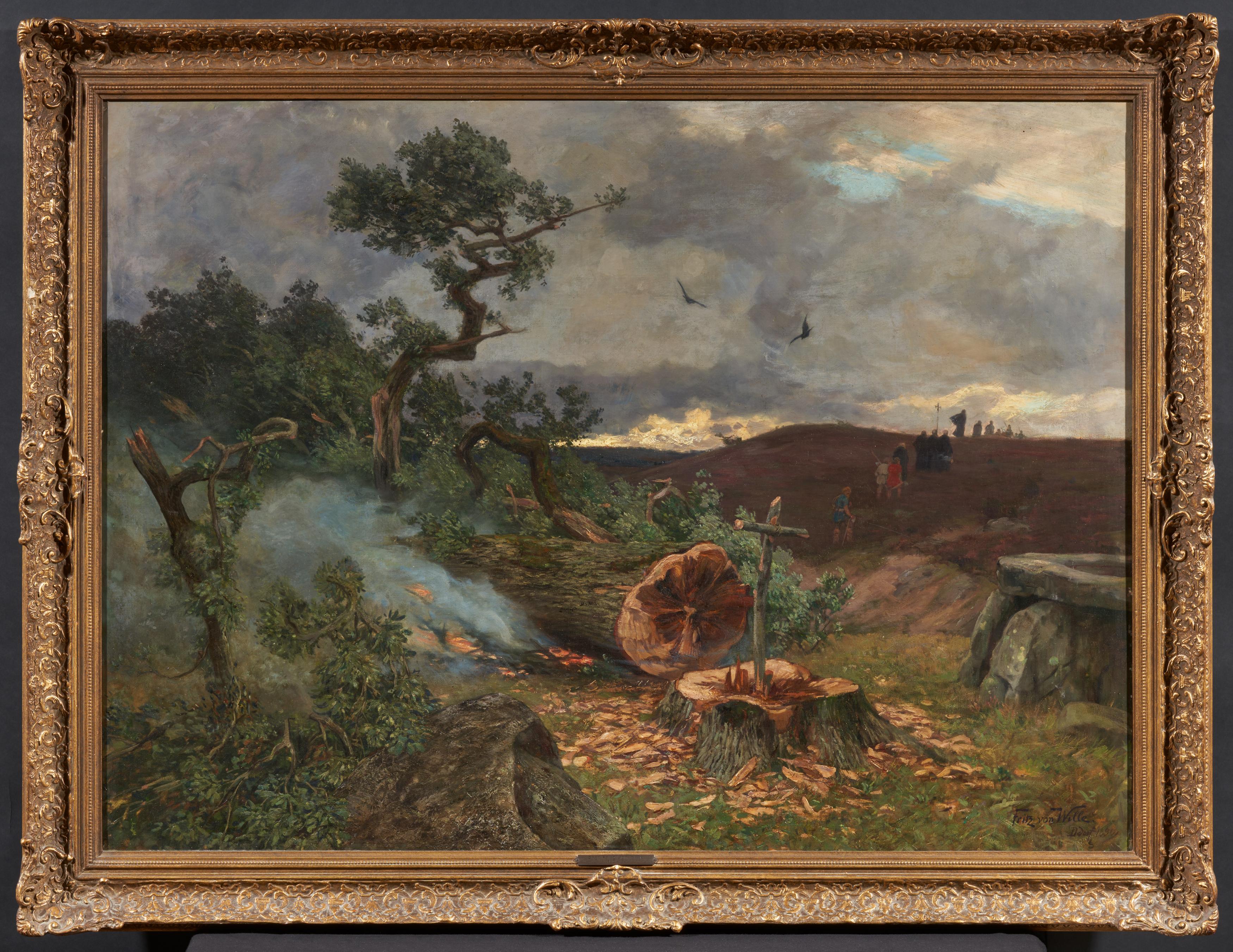 In den Jahren nach seiner Ausbildung an der Düsseldorfer Akademie und vor der Hinwendung zu den reinen Landschaftsmotiven der Eifel, zeigt Fritz von Wille noch viele erzählende und genrehafte Elemente in seinen Landschaftsaufnahmen. Er reist viel durch verschiedene Regionen Deutschlands, was ihn zu den Themen seiner Gemälde inspiriert, so wie es sich bei dem hier gezeigten Motiv der "Bonifatiuseiche" zeigt. Der Legende nach fällte Bonifatius als Bischof von Mainz und Missionar zur Christianisierung Germaniens im 8. Jahrhundert im hessischen Fritzlar eine Eiche, die als wichtiges heidnisches Heiligtum verehrt wurde. So wollte er dem Volk der Chatten die Ohnmacht der heidnischen Götter beweisen und sie zum Christentum bekehren.