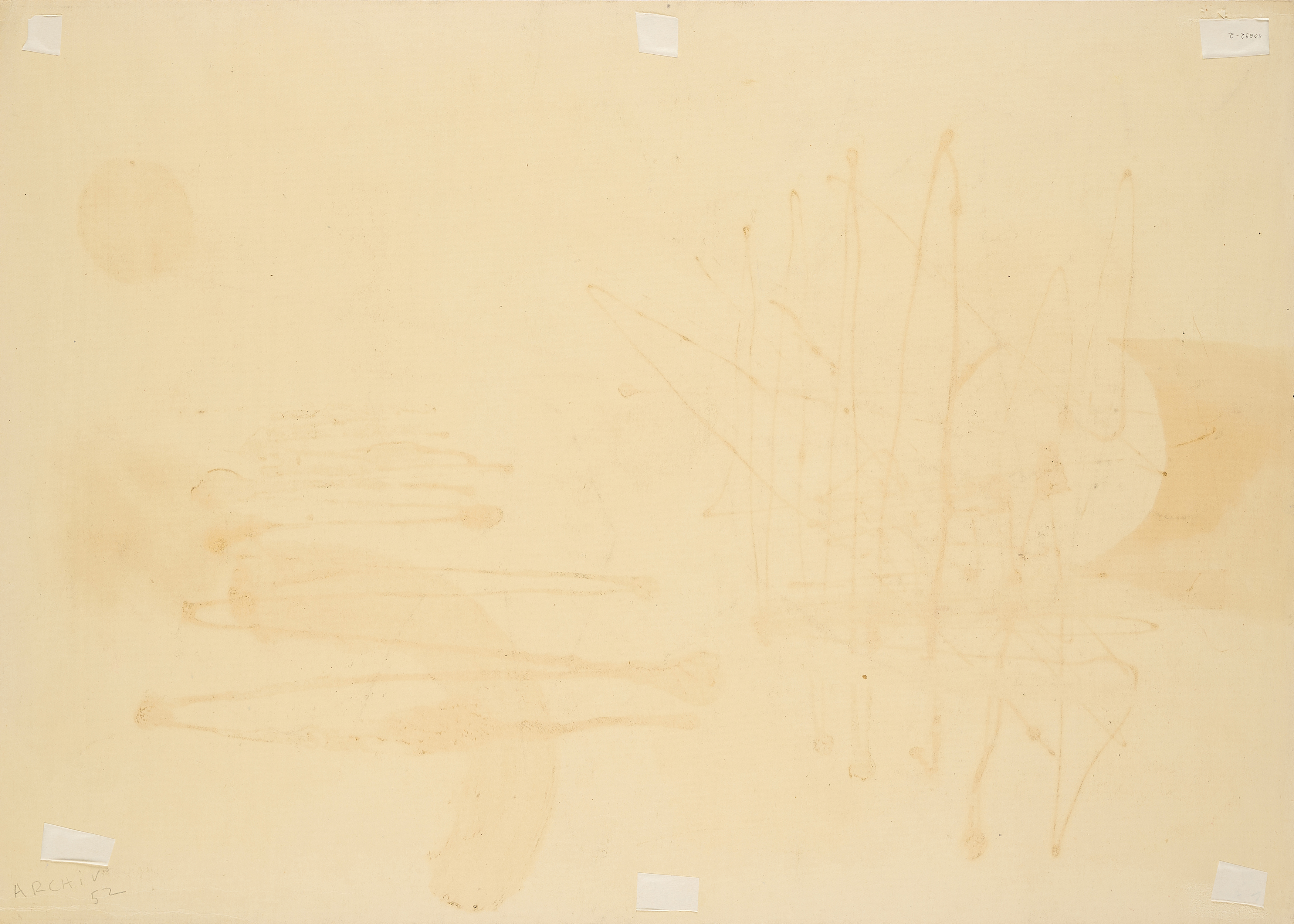 Blatt leicht gebräunt. Vereinzelt leichte Griffspuren. Leichte Knickspuren in den Randbereichen. Stecknadelloch am oberen Randbereich mittig. Verso leicht durchgeschlagene Farbe. Reste ehemaliger Montierung. Ansonsten befindet sich die Arbeit in einem guten Zustand.