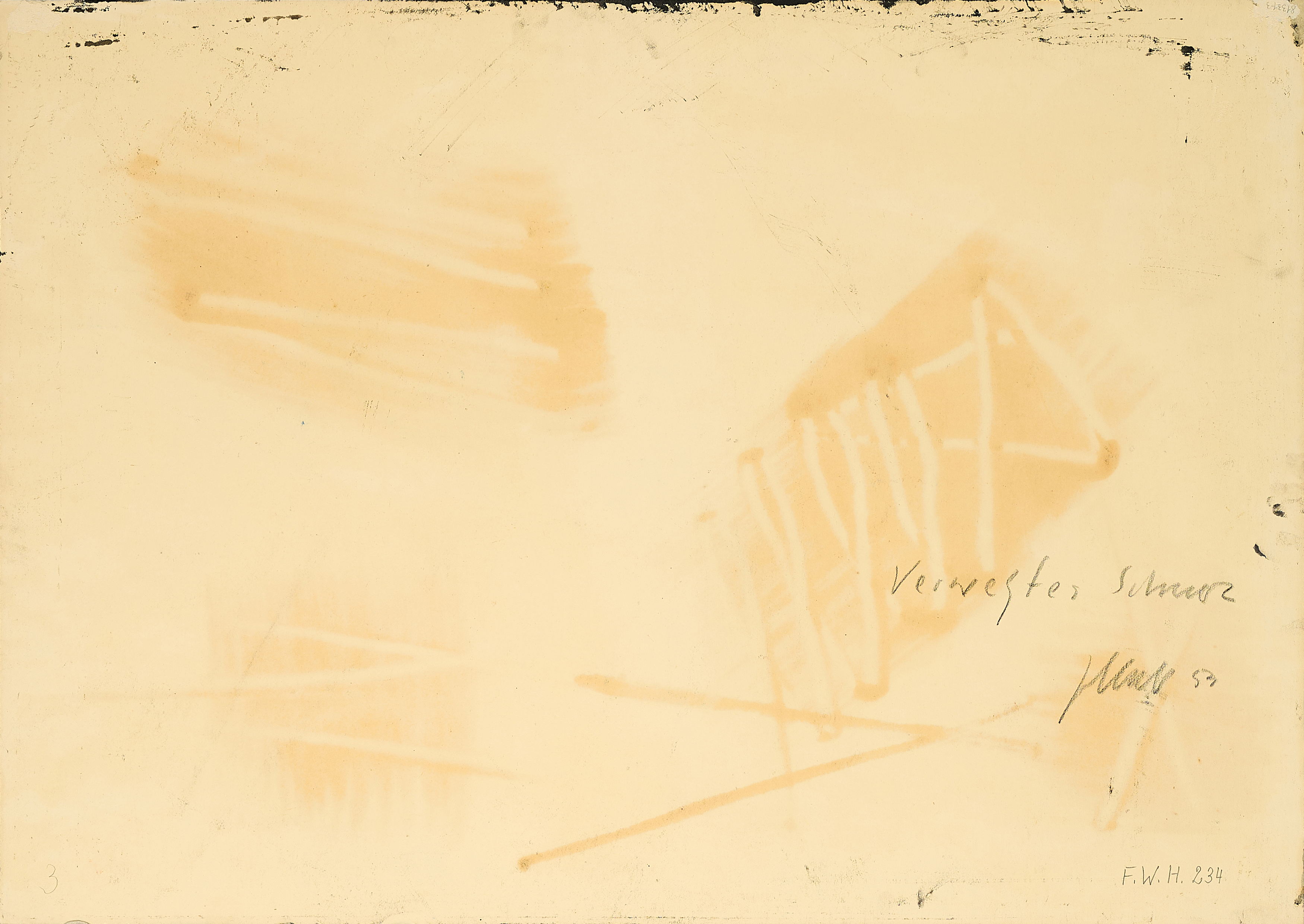 Bezeichnung: Signiert und datiert unten rechts: fwinter 53. Betitelt, signiert und datiert verso rechts: Verwehtes Schwarz. fwinter 53. Hier zudem bezeichnet (eiegnhändig?) F.W.H.234.