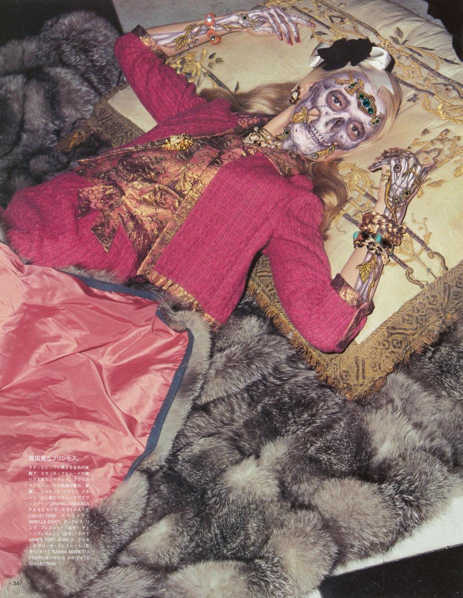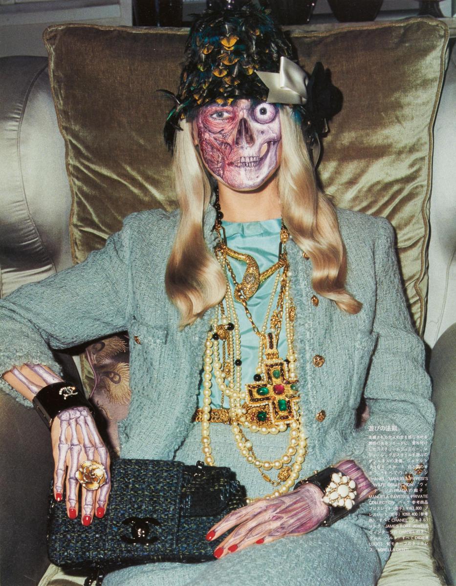 Technik: Farbstift, Kugelschreiber und Strasssteine auf Modemagazinseite.