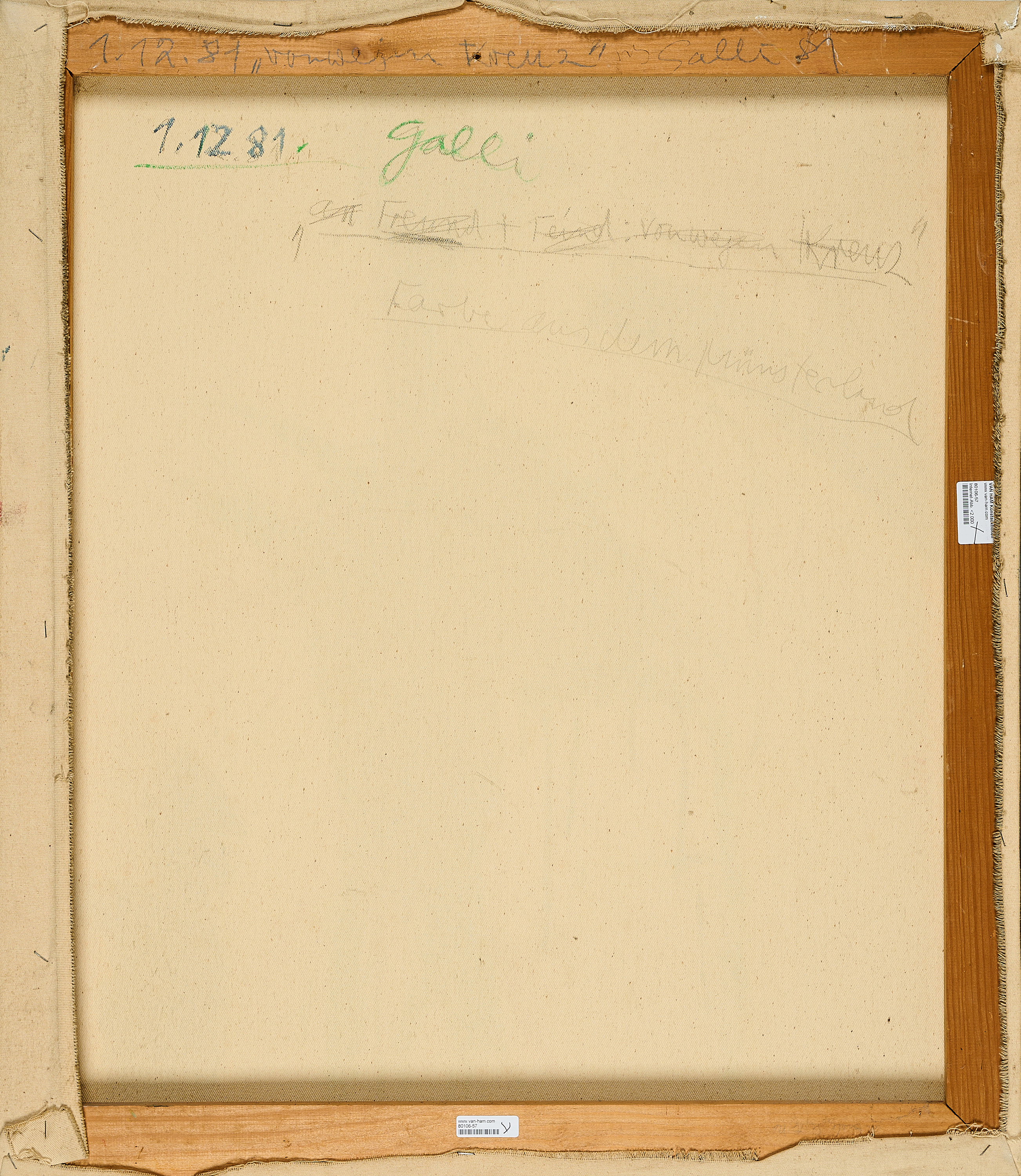 Verso datiert, signiert und bezeichnet: 1.12.81. Galli Farbe aus dem Münsterland. Sowie datiert, betitelt, signiert und datiert auf dem Keilrahmen: 1.12.81 "vonwegen Kreuz" Galli 81.