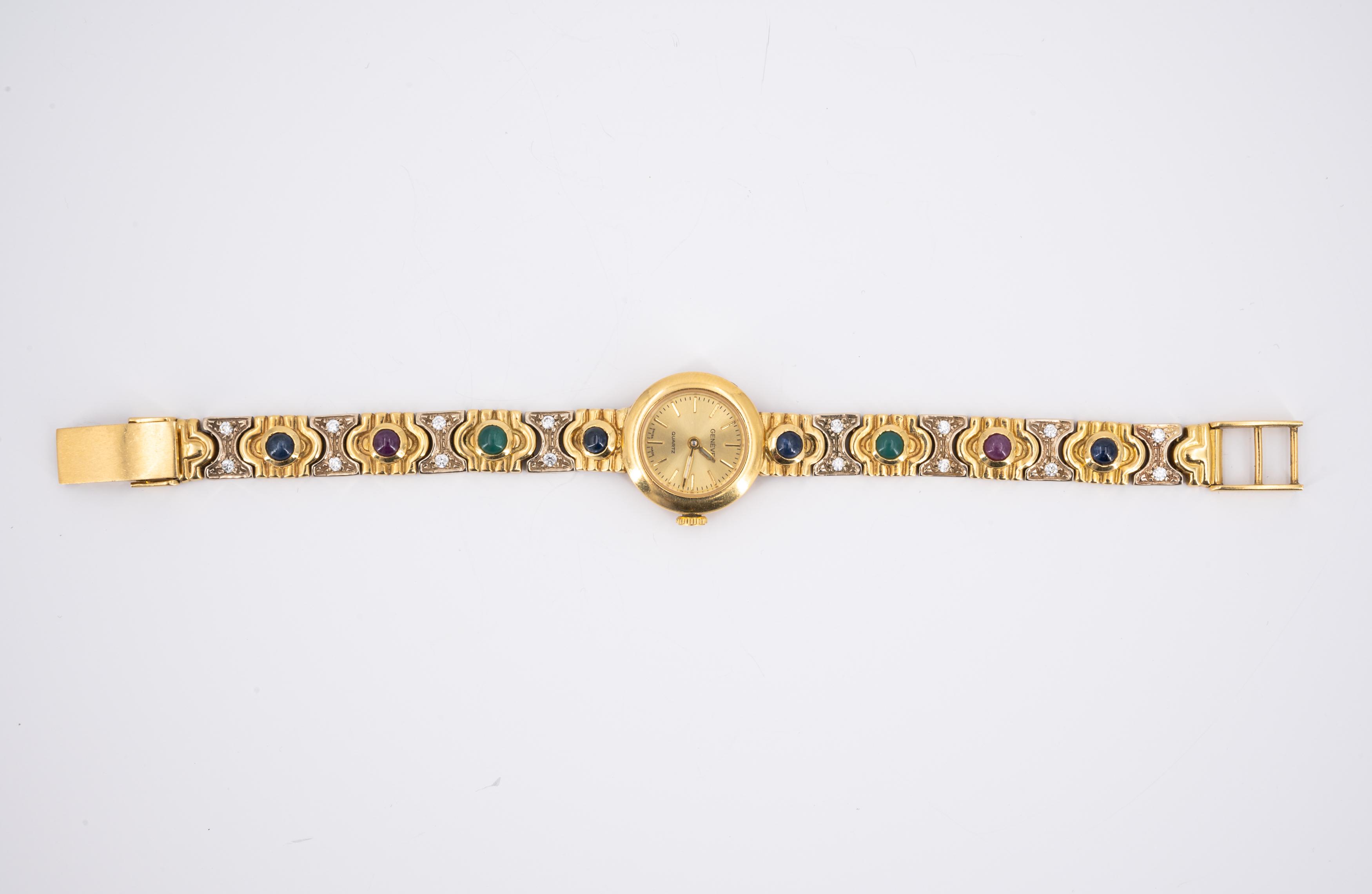 Gehäuse/Armband: 750/- Gelbgold, Armband Diamant- und Farbsteinbesatz, Zffbl. golden, Zeiger/Indizes golden.