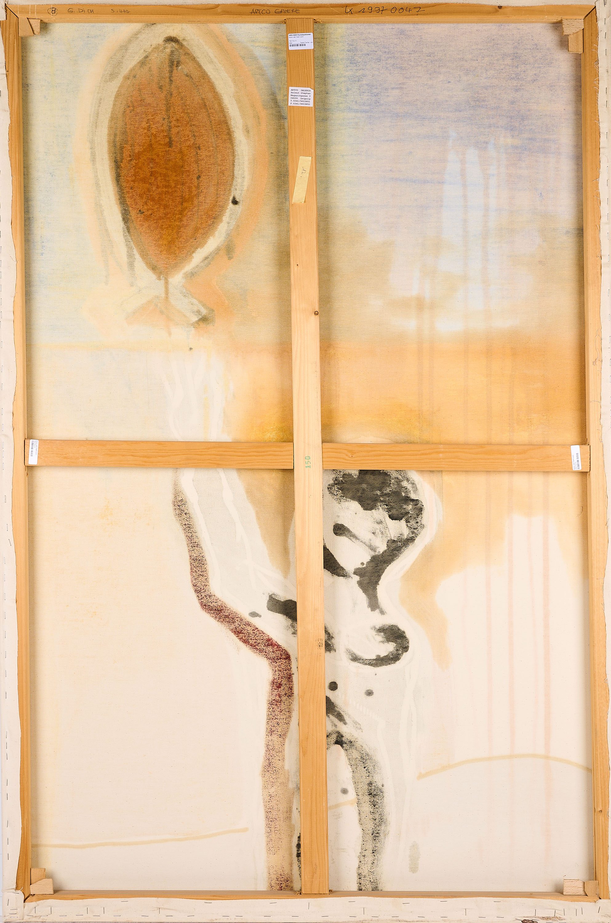 Geringe Leinwandspannung. Vereinzelt leichte Bereibungen an den Kanten. Ansonsten sehr guter Zustand.