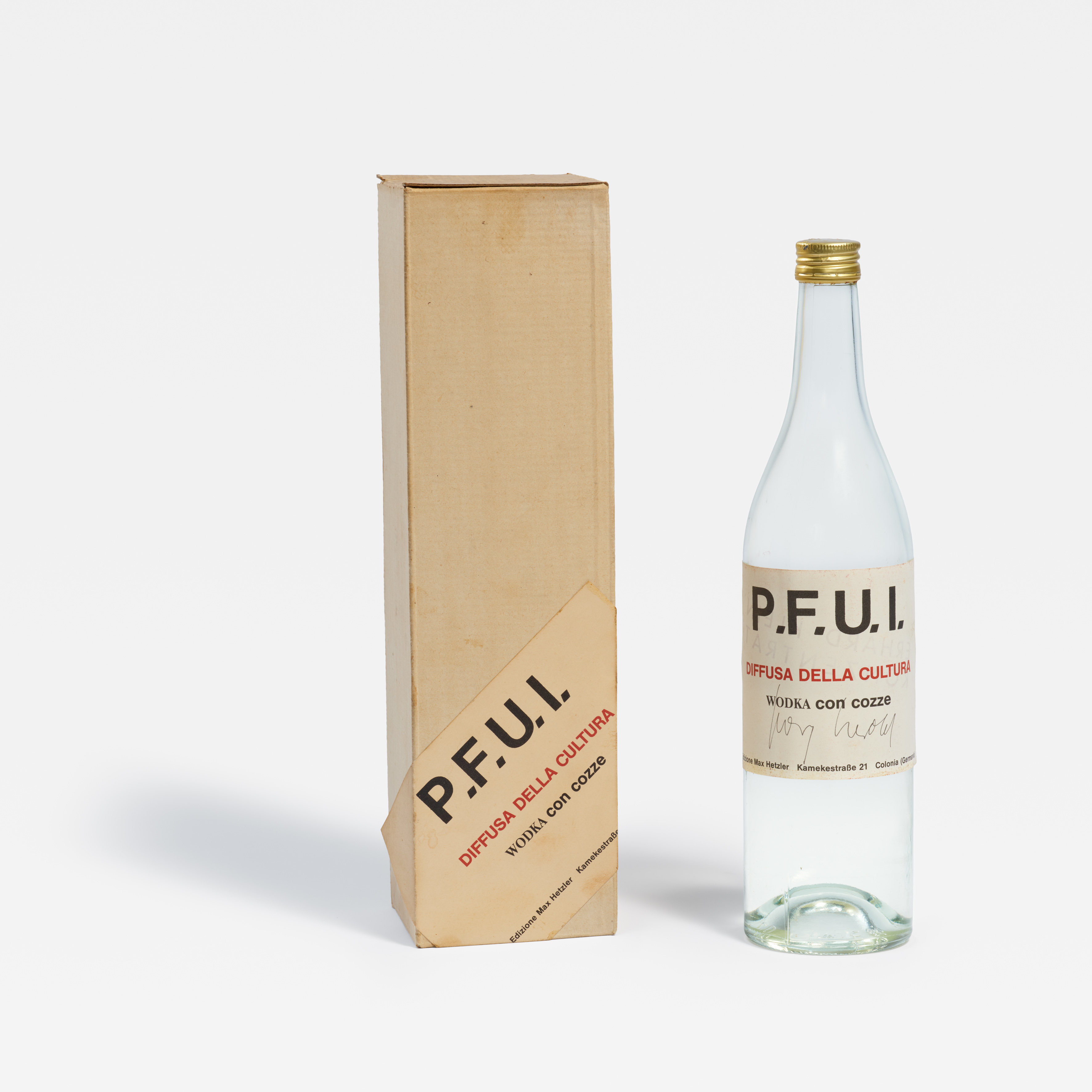 Bezeichnung: Signiert auf dem Etikett der Flasche. Sowie nummeriert und signiert auf der Verpackung.Galerie Max Hetzler, Köln (Hrsg.).