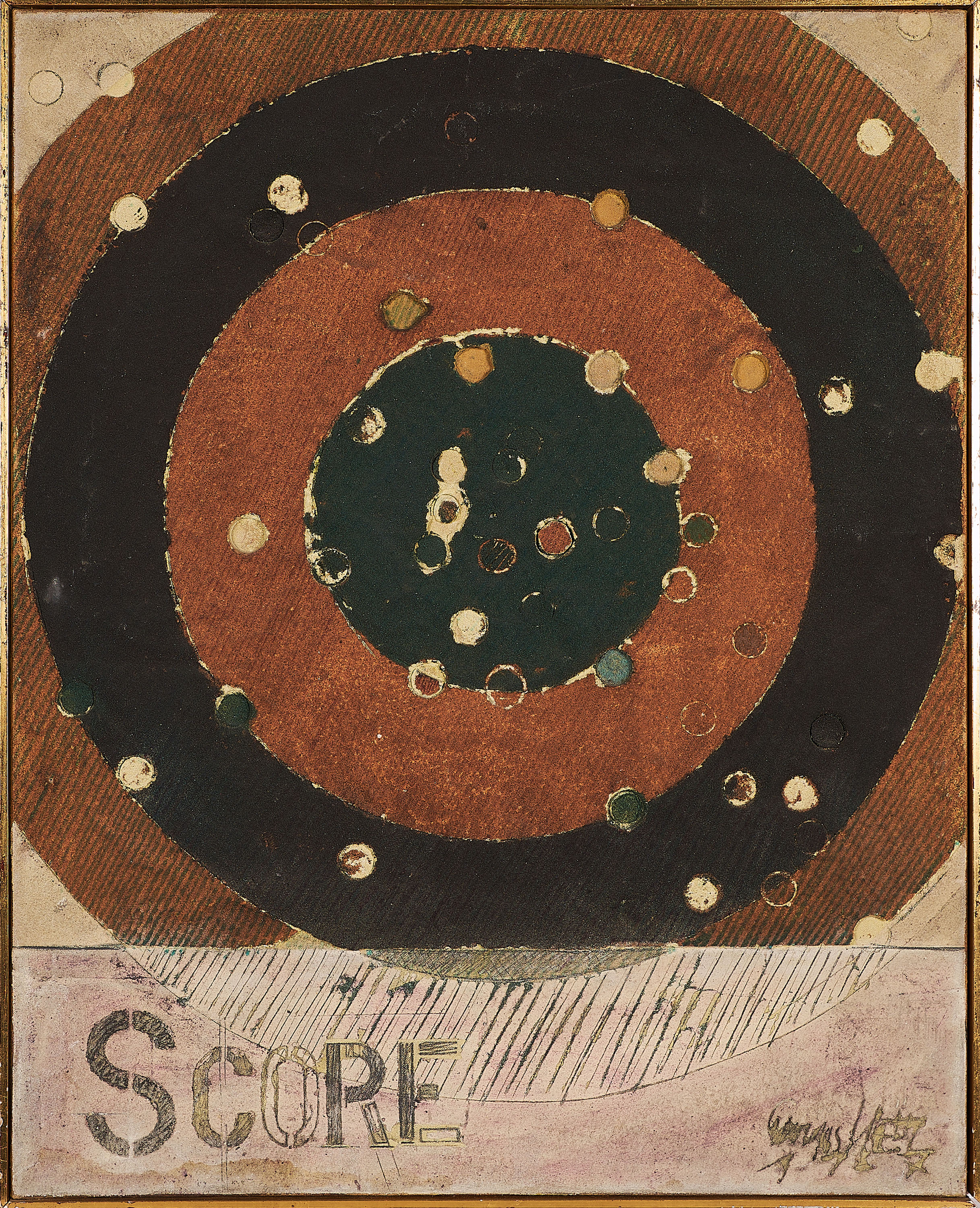 Bezeichnung: Signiert und datiert unten rechts: Georges Noel 1967. Sowie bezeichnet, betitelt, signiert und datiert verso: 25-Fig- (Score No 1) SCORE. OCRE avec impacts Georges Noel 1967.