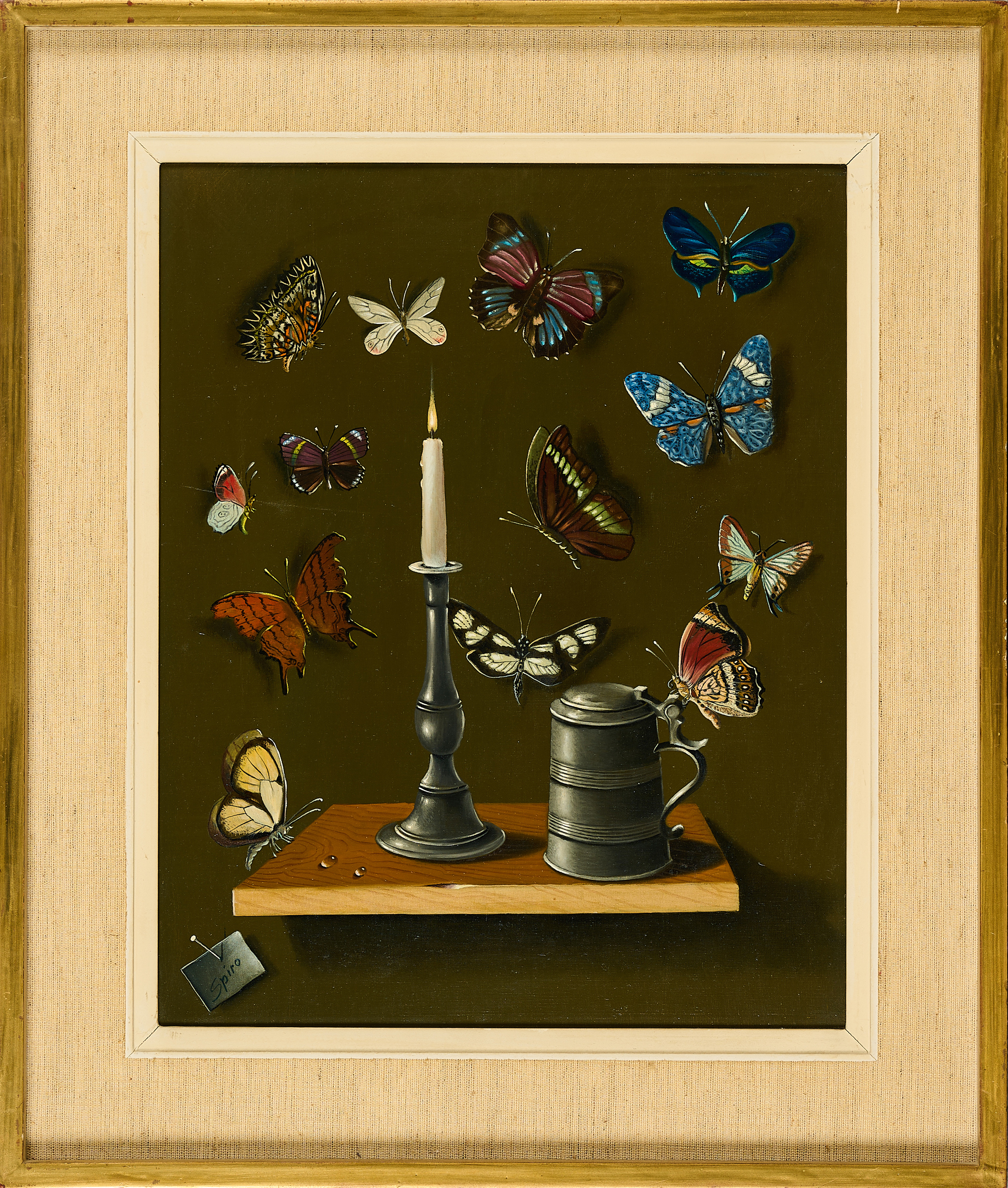 Titel: Stillleben mit Kerze und Schmetterlingen.