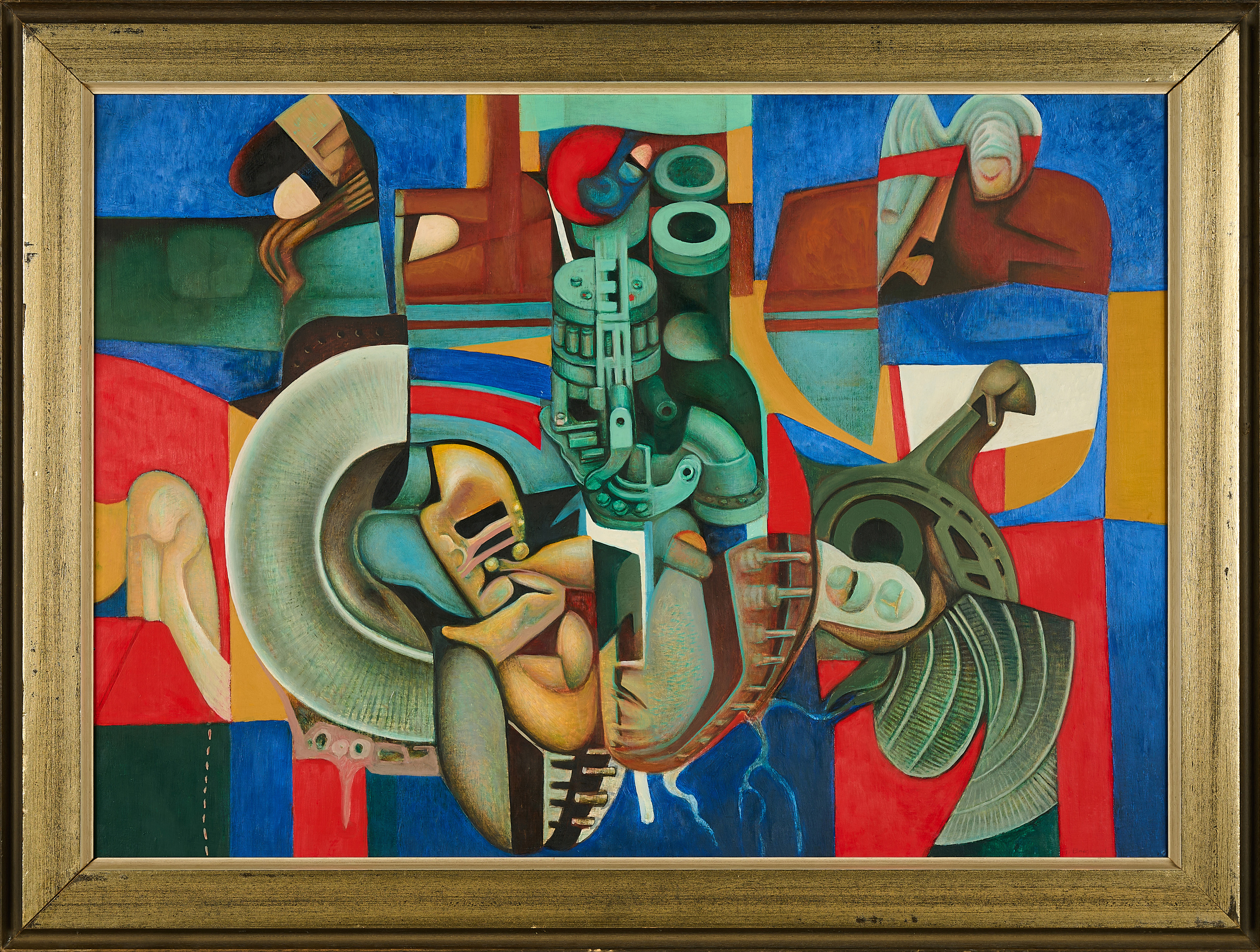 Bezeichnung: Signiert und datiert unten rechts: G. Bregnard 74. Sowie signiert, bezeichnet, betitelt und datiert verso: Gérard Bregnard 2901 Bressaucourt Suisse "Le Pompiste amoureux" Huile 1974.