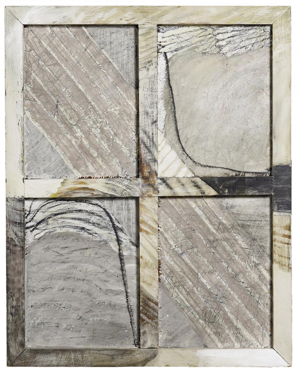 "Mehrebenenfenster". 1964. Acryl auf vier Leinwänden (je: 40,5 x 30,cm) und Holz (85 x 67 x 5cm). Signiert, betitelt,