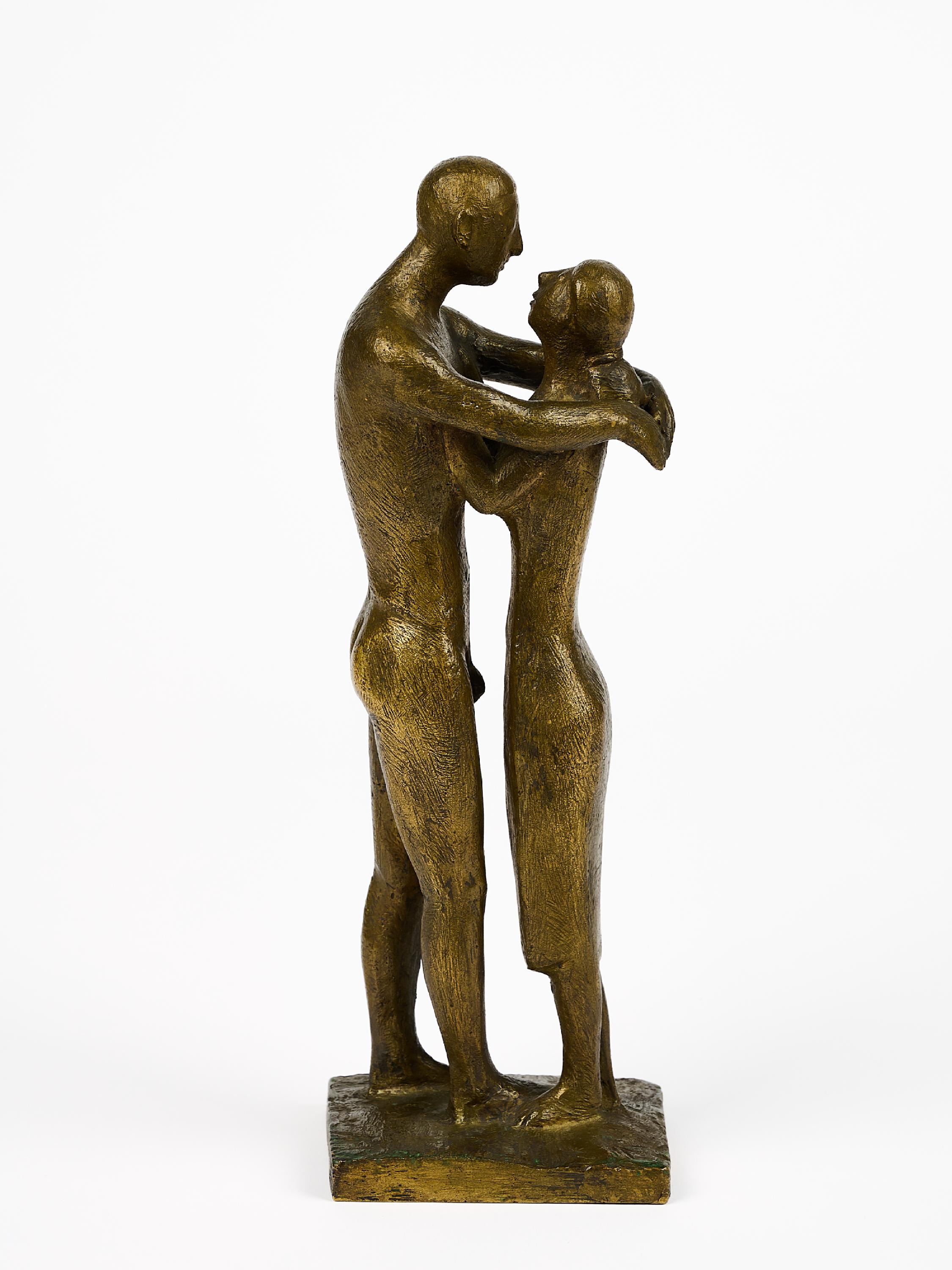 Minimale Flecken am Kopf des Mannes und vereinzelt am Kopf der Frau. Minimale Staubablagerungen an den Armen der Frau in den Vertiefungen und an den Füßen. Minimal einsetzender Grünspan an der Stelle, wo die linke Hand der Frau den Mann berührt. Grünliche Partien an der Plinthe an allen Ecken wohl werkimmanent. Ansonsten guter Zustand.