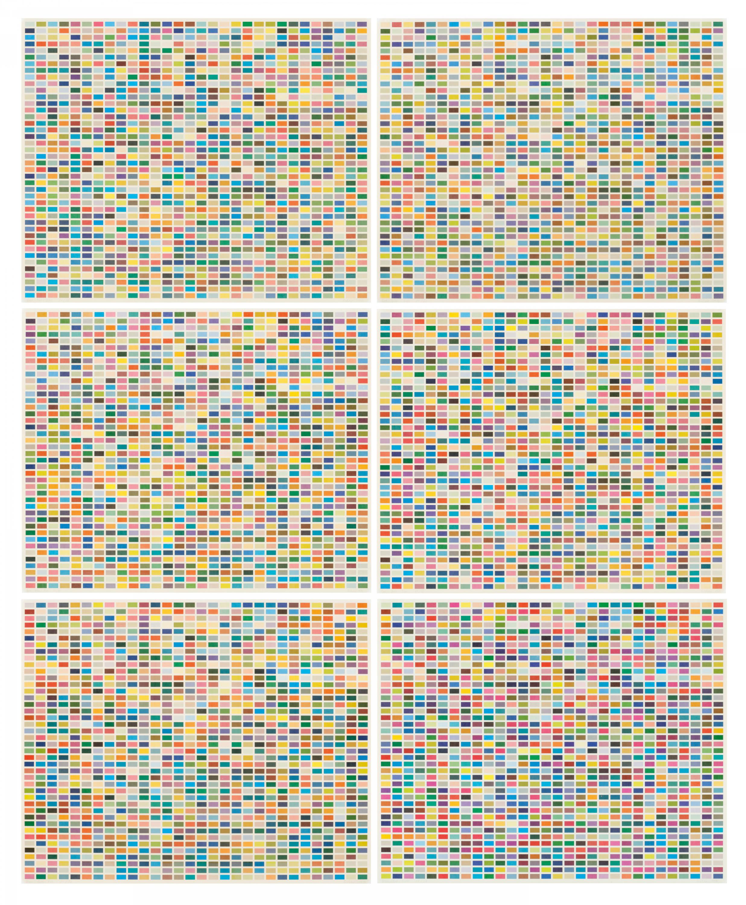 Die sechs Offsetdrucke enthalten als Motiv jeweils 1260 Farben in Form von kleinen, horizontal und vertikal angeordneten Rechtecken, wobei jedes Blatt eine andere Verteilung der Farbtöne zeigt. Der Künstler hat bei der Festlegung der Farben keinerlei Subjektivität zugelassen, sondern vielmehr den Zufall als bildkonstituierendes Prinzip eingesetzt. Denn die Farbzusammensetzungen wurden ausgelost, indem er für jedes Kästchen drei Papierzettel mit den Ziffern eins bis neun aus einem Topf zog. Die auf diese Weise generierten Zahlen geben die verschiedenen Anteile der drei Primärfarben an; zum Beispiel bedeutet 482 beim Drucken das Mischungsverhältnis vier Teile Blau, acht Teile Rot und zwei Teile Gelb. Das Auslosen als Zufallsgenerator verhindert zwangsläufig eine Ordnung nach den Abstufungen eines Farbspektrums oder nach intendierten kompositorischen Kontrasten. Stattdessen weist die Farbgebung ein bewusst organisiertes Chaos im Sinne eines Zustands höchster Unordnung auf.