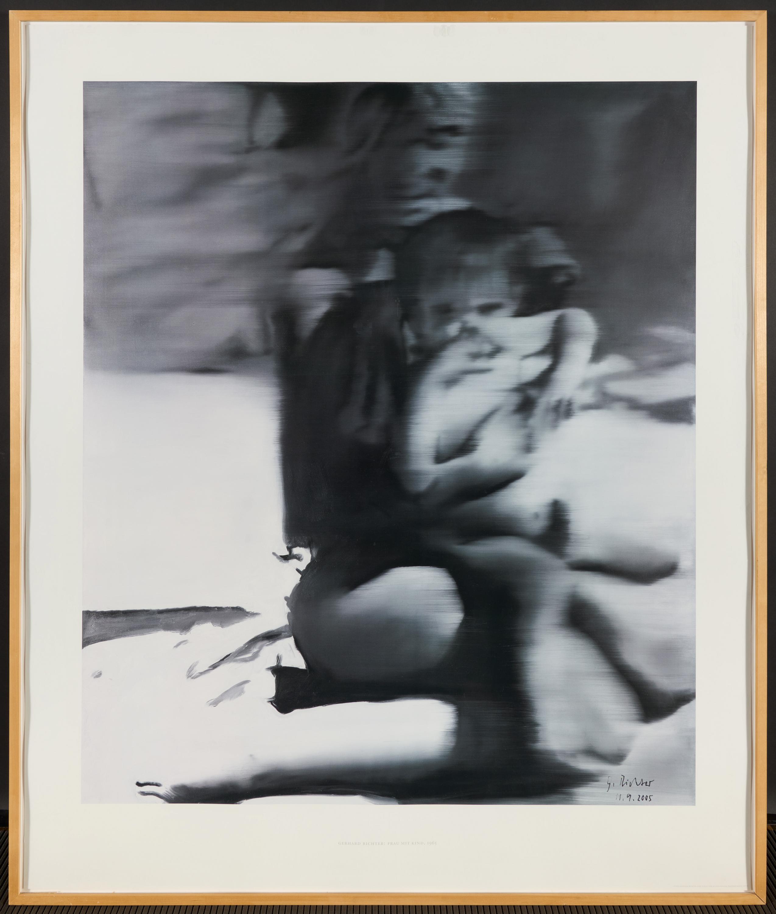 2005 greift Gerhard Richter das Thema erneut auf, indem er das frühe Gemälde von 1965 als Vorlage für einen Offsetdruck im identischen Format, aber mit dem leicht verkürzten Titel Frau mit Kind wählt. Neben der Edition in einer Auflage von 32 + 8 a. p. Exemplaren (WVZ.Nr. 130 der Editionen), entsteht auch eine unsignierte Posteredition. Aus dieser Edition stammt das hier angebotene, vom Künstler zur Verfügung gestellte Blatt, das Gerhard Richter durch seine doppelte Signatur und Datierung auf die Jahre 2005 und 2022 ausdrücklich autorisiert und mit dessen Motiv er sich besonders identifiziert. (Dietmar Elger).