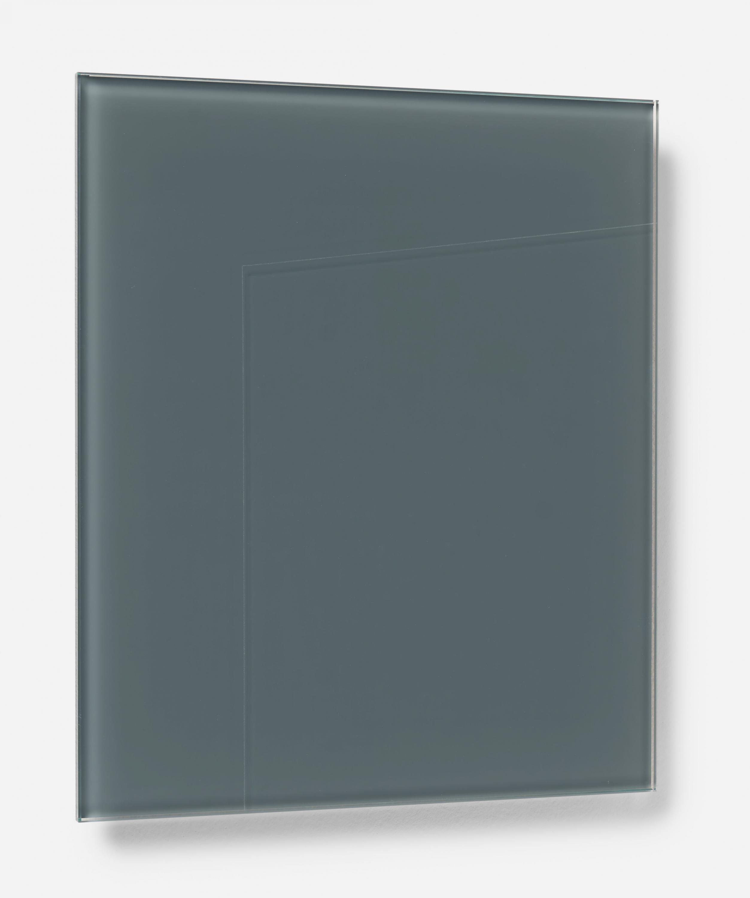 Technik: Emaillefarbe (grau) auf Glas, einbrennlackiert, vorderseitig graviert.