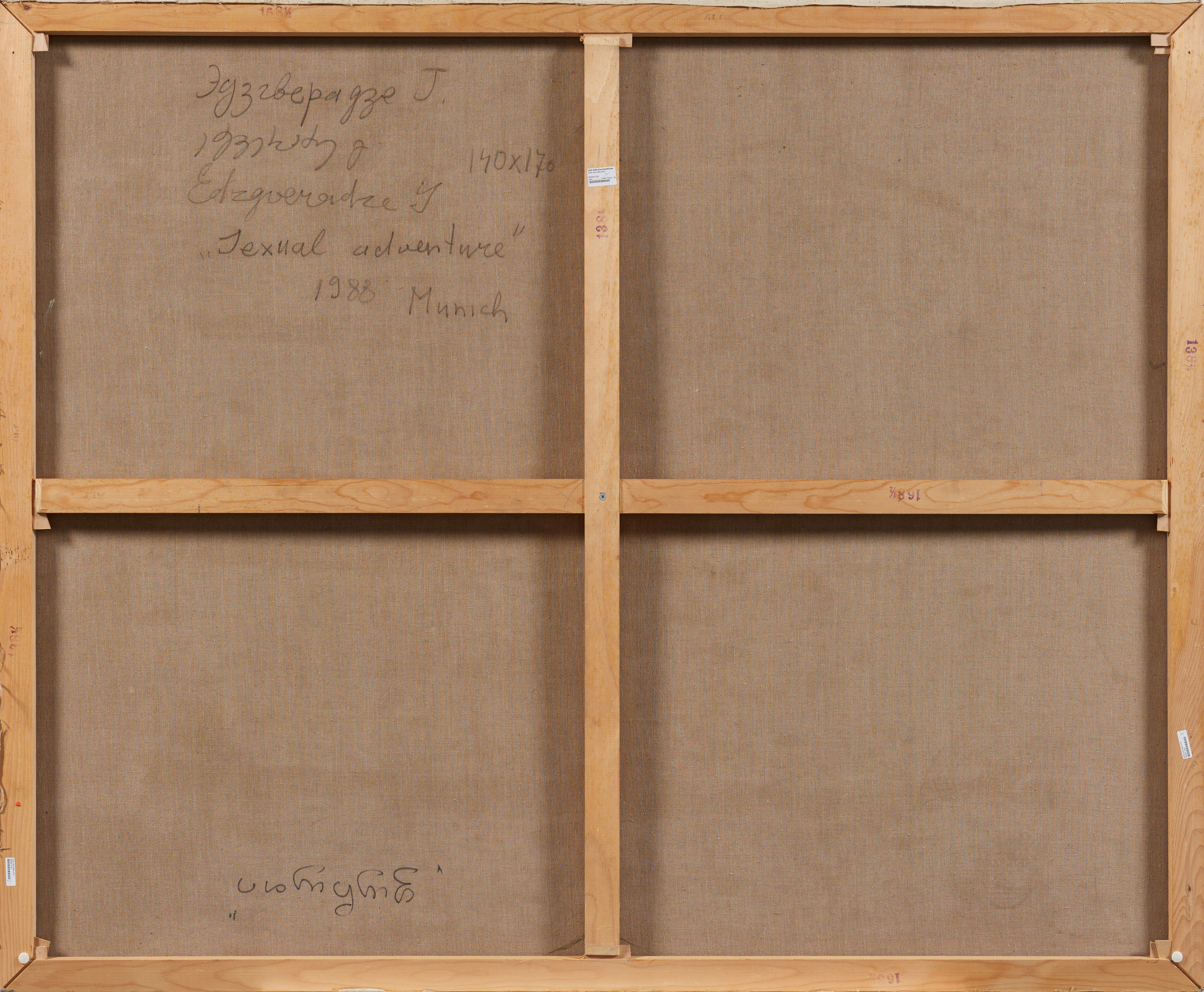 Bezeichnung: Signiert, bezeichnet, signiert, betitelt und datiert verso: Edzgveradze G. ... (auf Georgisch) 140 x 170 Edzgveradze G "Sexual adventure" 1988 Munich.