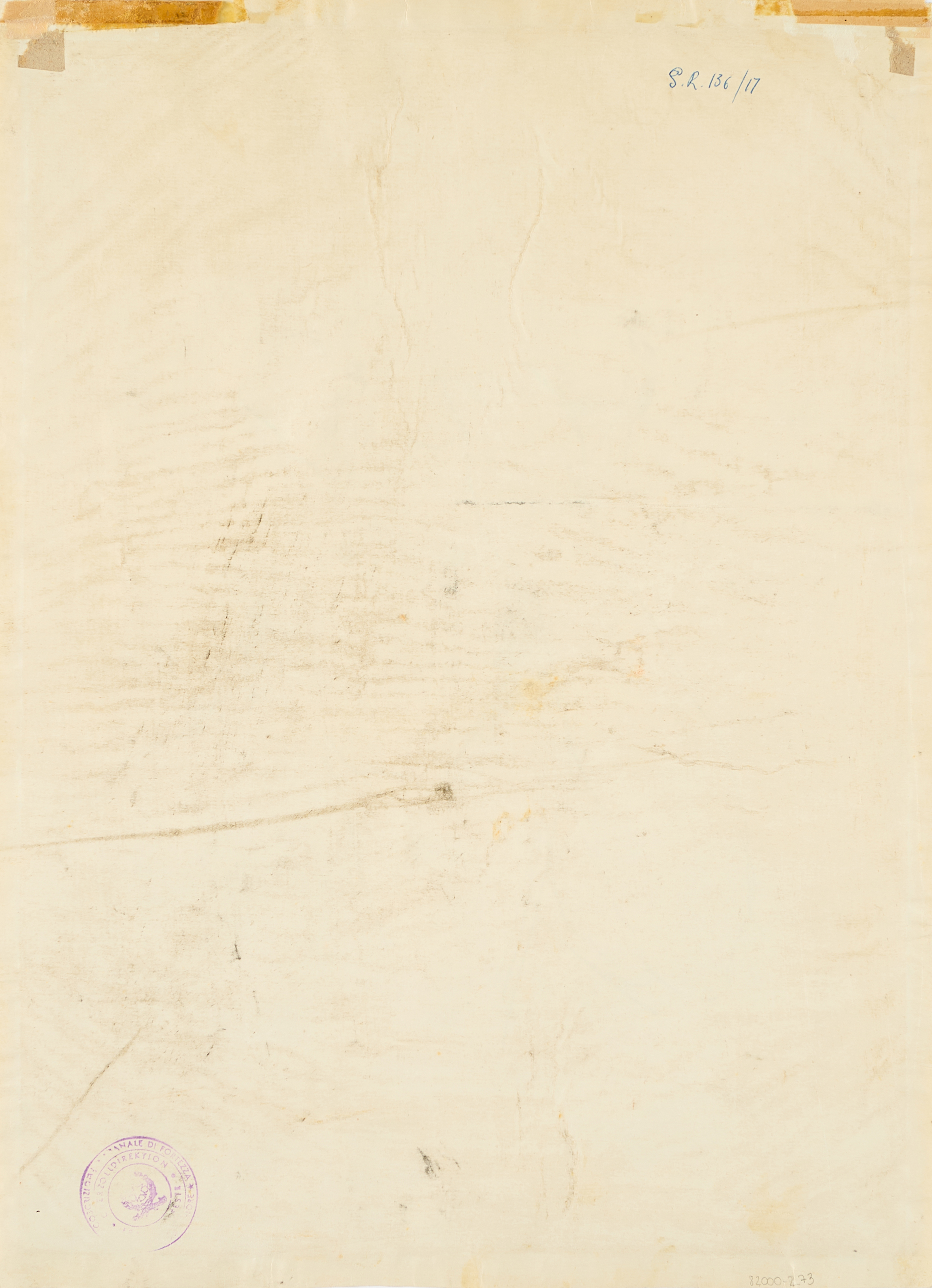 Papier gewellt und mit Knitterspuren. Einzelne helle, bräunliche Verschmutzungen. Leimspuren an der unteren Kante. Fingerabdrücke. Trägerpapier unregelmäßig geschnitten. Verso schwarzer Aufrieb, Oberrand mit Resten und Spuren alter Montierung. Ansonsten guter Zustand.