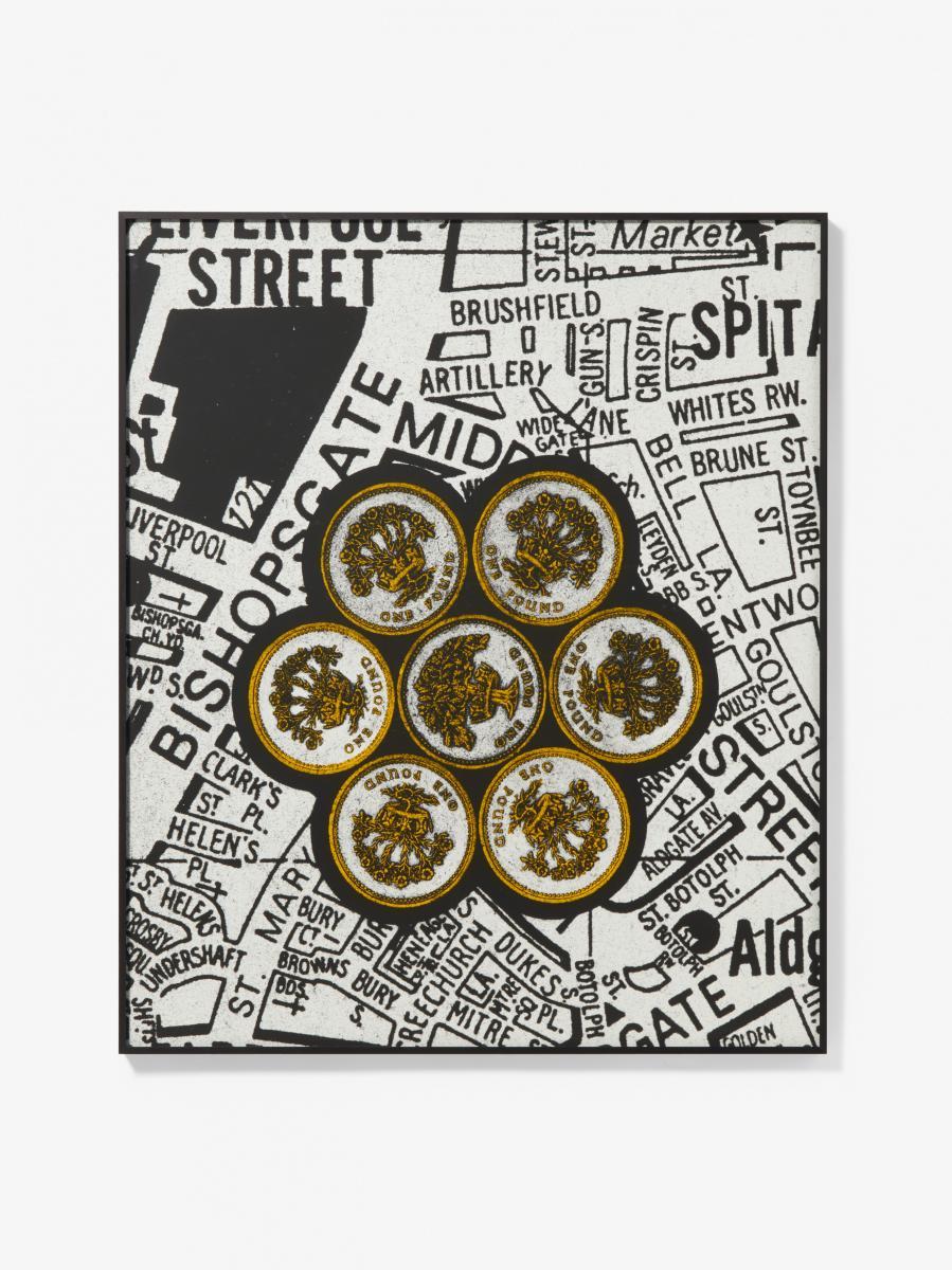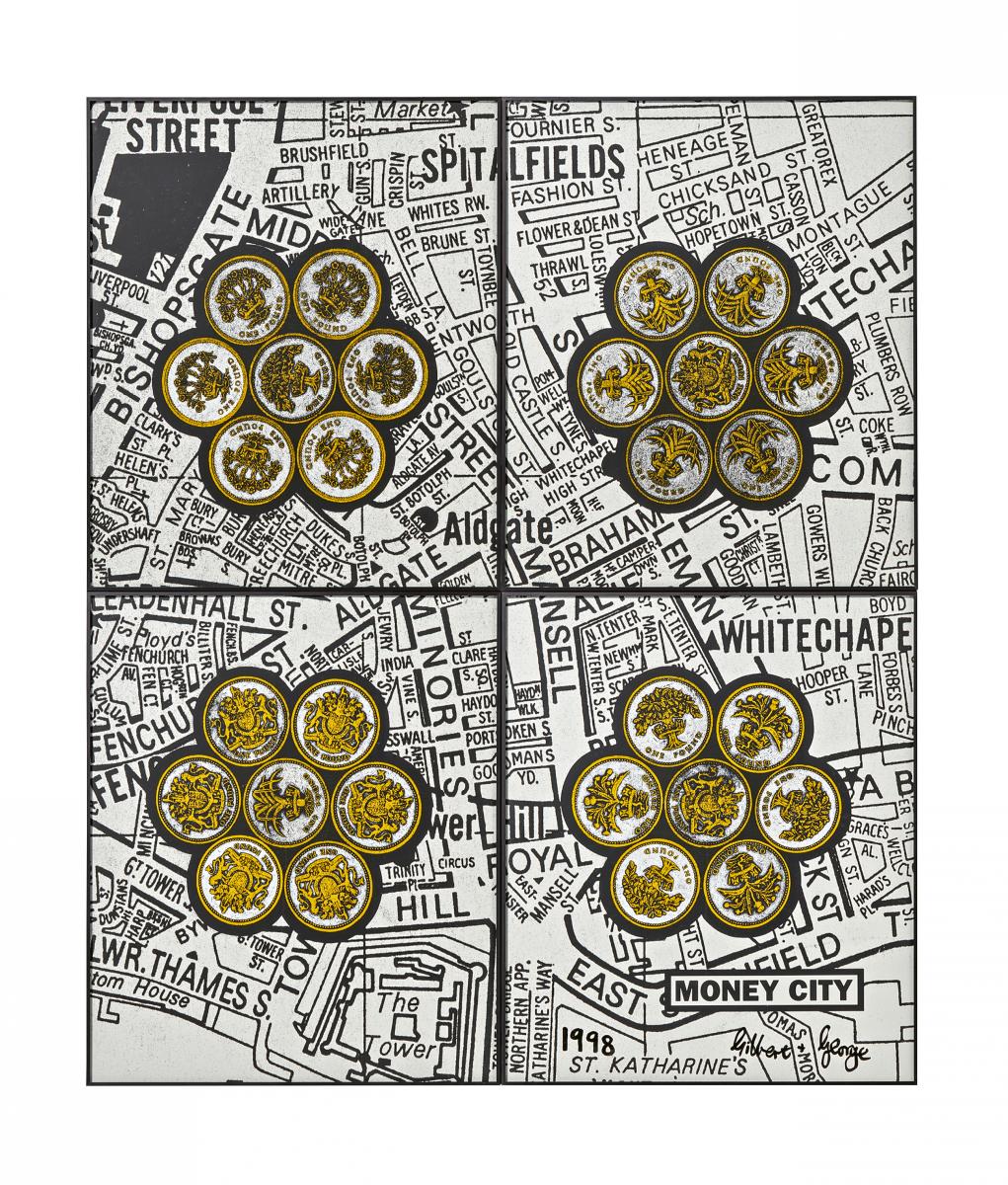 Die Stadt London, das städtische Umfeld, typische Motive der Hauptstadt sowie das kritische Porträt der Gesellschaft, Politik und Wirtschaft sind allgegenwärtig im Oeuvre von Gilbert & George. So suchen die beiden Künstler stets die Auseinandersetzung mit einem Thema, welches durch Bilder, auch oft durch die Stadt selbst, transferiert wird. In der vorliegenden Arbeit "Money City" taucht der Betrachter in einen Straßenplan der Bezirke Spitalfields und Whitechapel ein und wird Teil der dort lebenden Gesellschaft. Ironisch positionieren die Künstler auf den Arbeiterbezirken 1 Pfund-Münzen und betiteln das Werk "Money City".