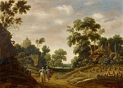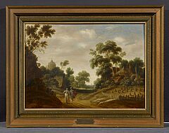 zugeschrieben. Landschaft mit Paar. Öl. Holz x 45 Rahmen: