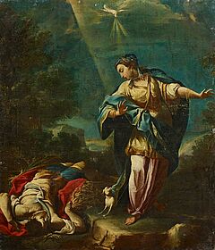 Auch dem bei uns zu versteigernde Gemälde liegt der Epos Tassos als Vorlage zugrunde. Bei dem vorliegenden Werk ist jener entscheidende Moment des Dramas dargestellt, in dem sich die Zauberin dem schlafenden Ritter nähert und Rache üben will. Just in dem Moment, als sie den bezaubernden jungen Mann erblickt, verliebt sie sich unsterblich in den heldenhaften Ritter. Die Szene ist in einer nahezu bühnenhaft anmutenden Waldlandschaft situiert, in der der muskulöse Heroe in Laub gebettet schlummert. Mit einer dramatischen Geste nähert sich ihm die schöne Armida, die in wallendes, orientalisches Gewand gehüllt ist.