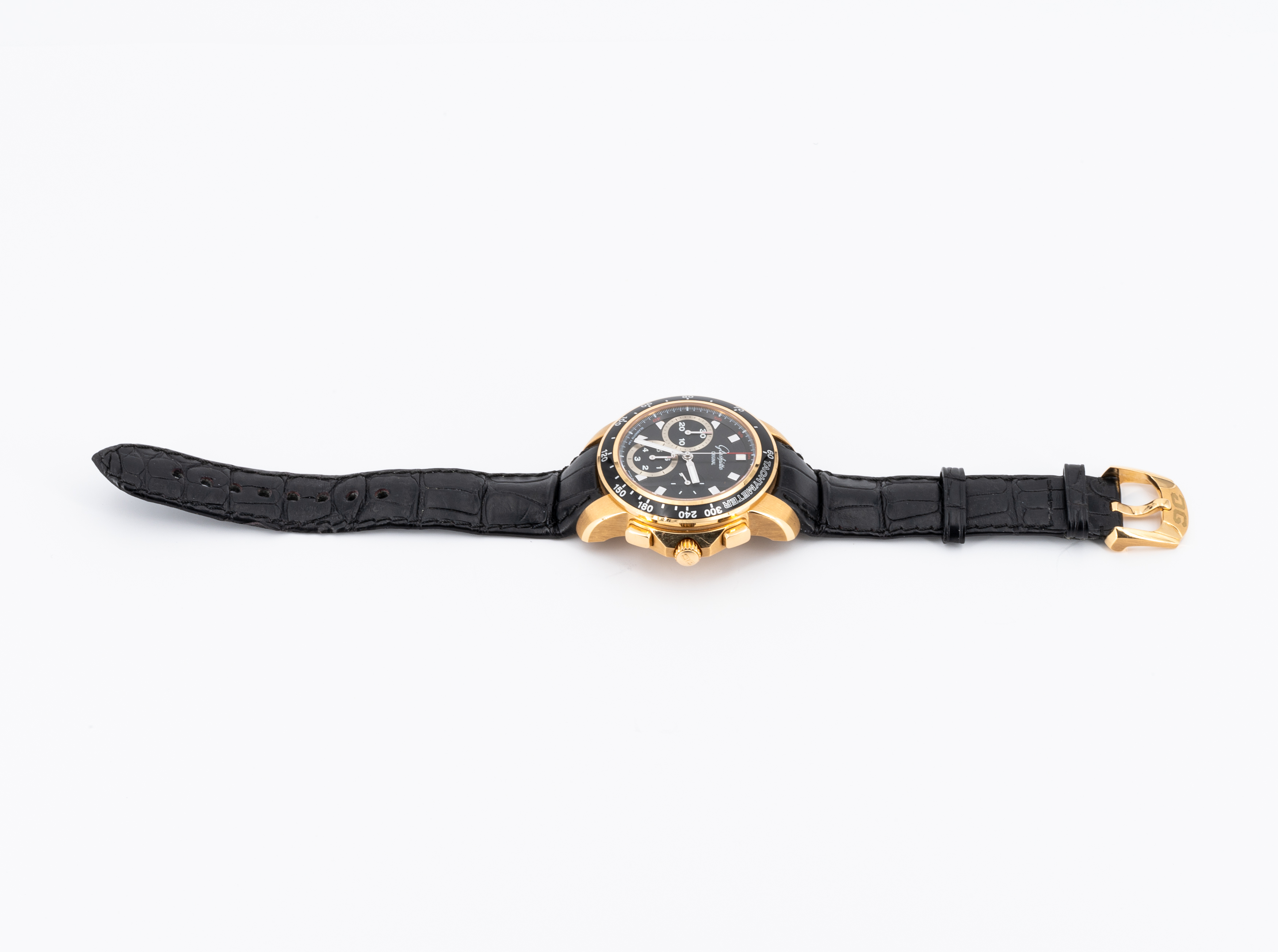 Gehäuse/Armband: 750/- Gelbgold, Lederband mit Dornschließe, Zffbl. schwarz, Zeiger und Indizes silbern, Leuchtmasse.