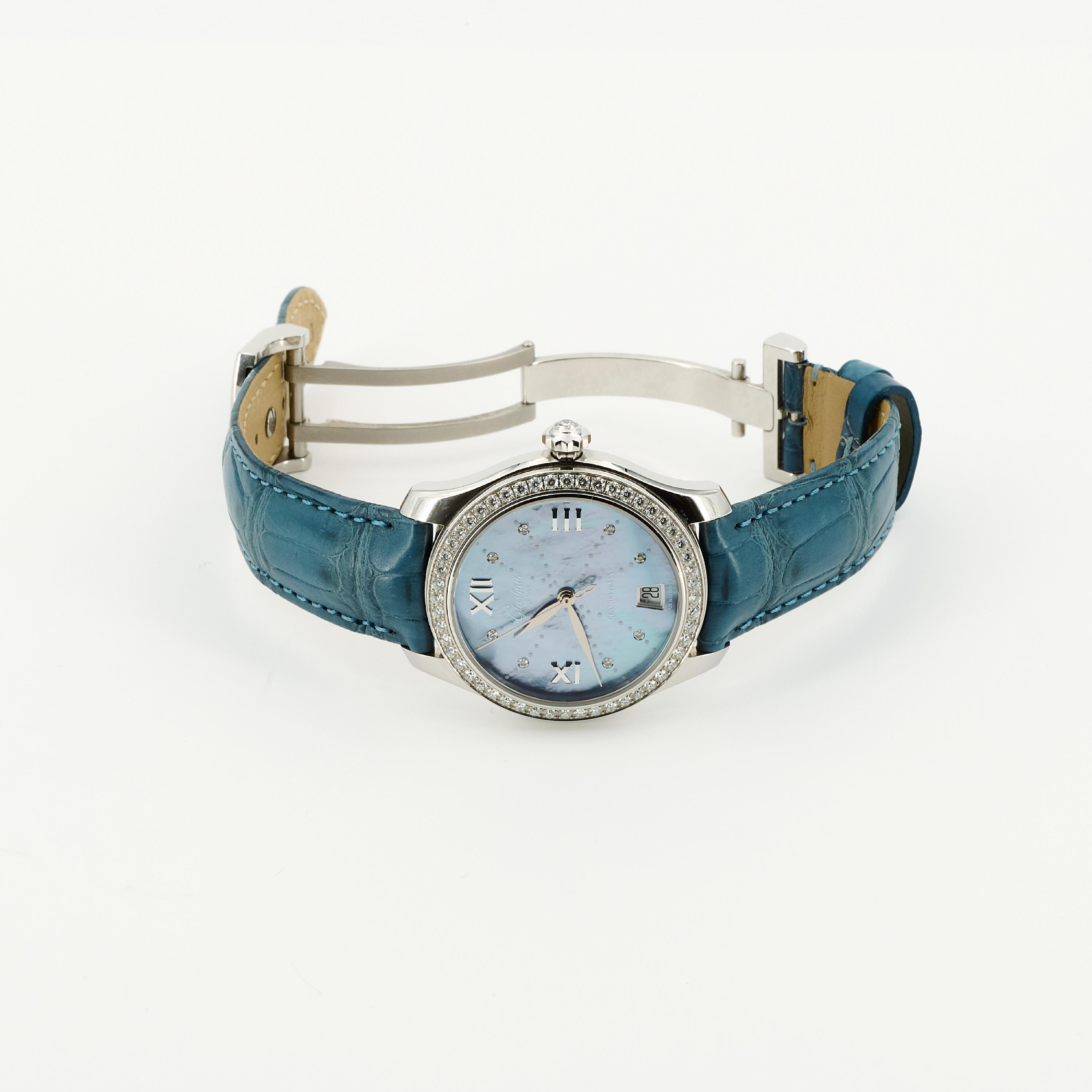 Gehäuse/Armband: Stahl, Lederarmband mit Faltschließe, Zffbl. Perlmutt blau, Zeiger und römische Indizes silbern.