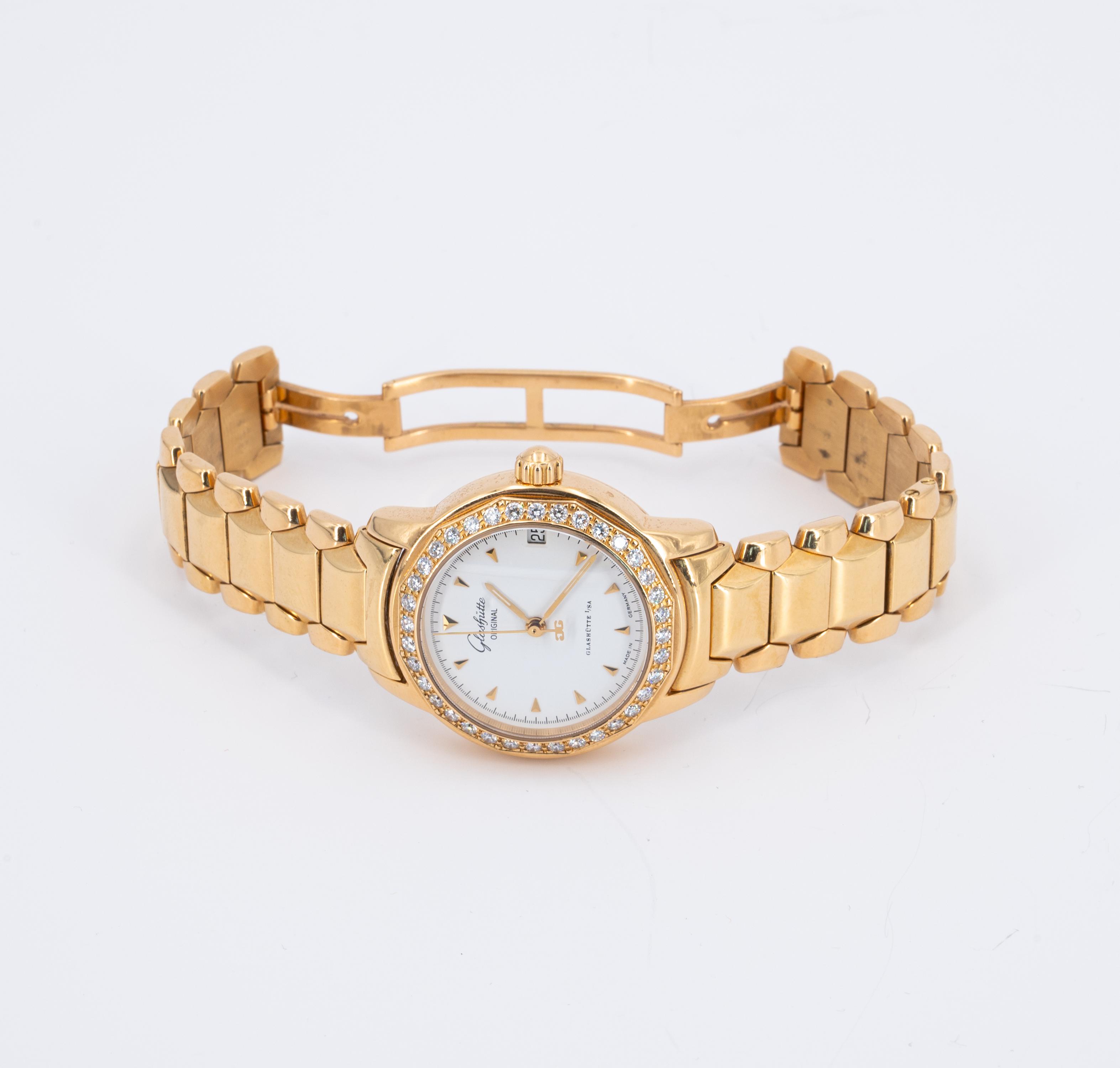 Gehäuse/Armband: 750/- Gelbgold, Armband mit Schmetterlings-Schließe, Lünette mit Diamanten sehr guter Qualität, Zffbl. weiß, Minuten- und Stunden-Zeiger mit Leuchtmasse.