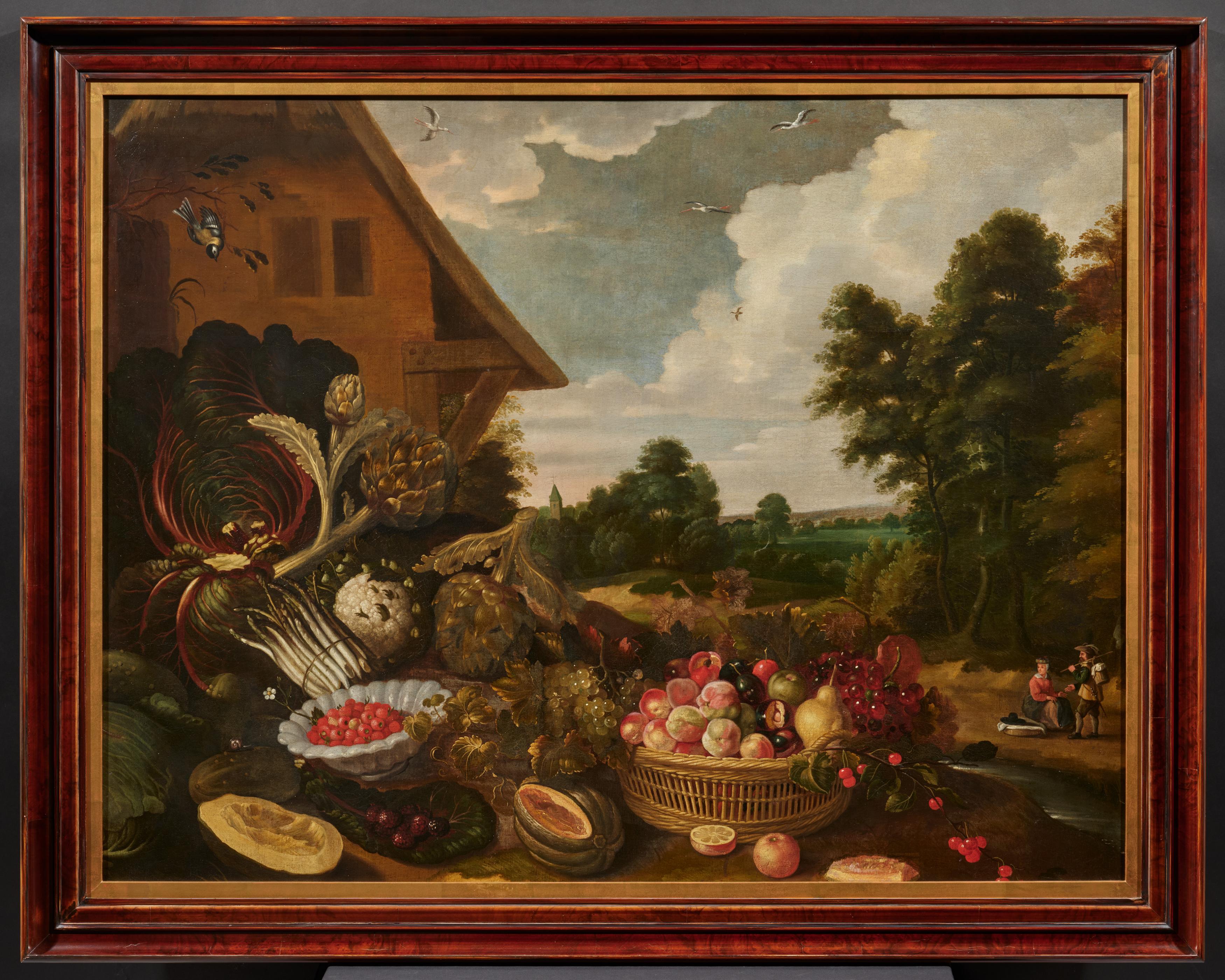 Titel: Großes Stillleben mit Früchten und Gemüse vor einem Bauernhaus.