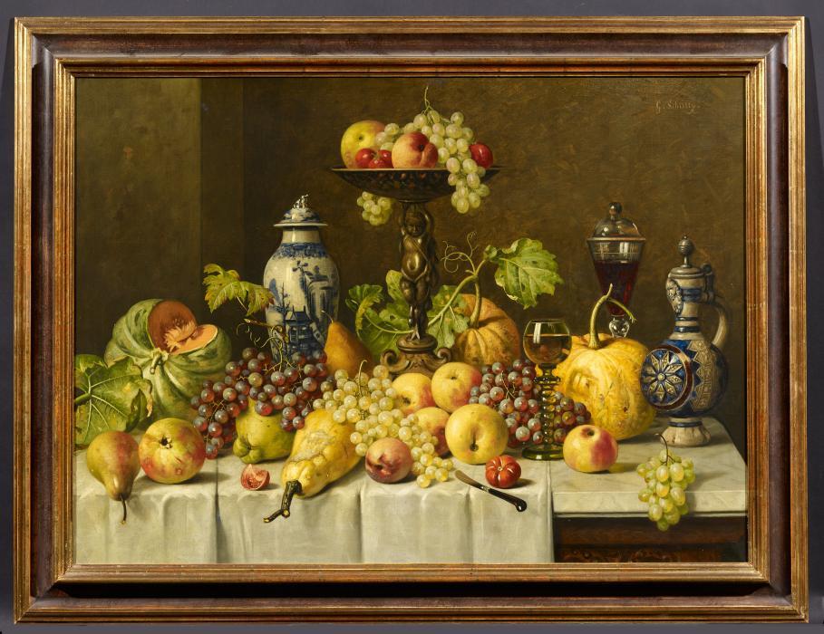Großes Früchtestillleben. Signiert oben rechts: G. Schultz. Öl auf Leinwand. 80 x 110cm. Rahmen.