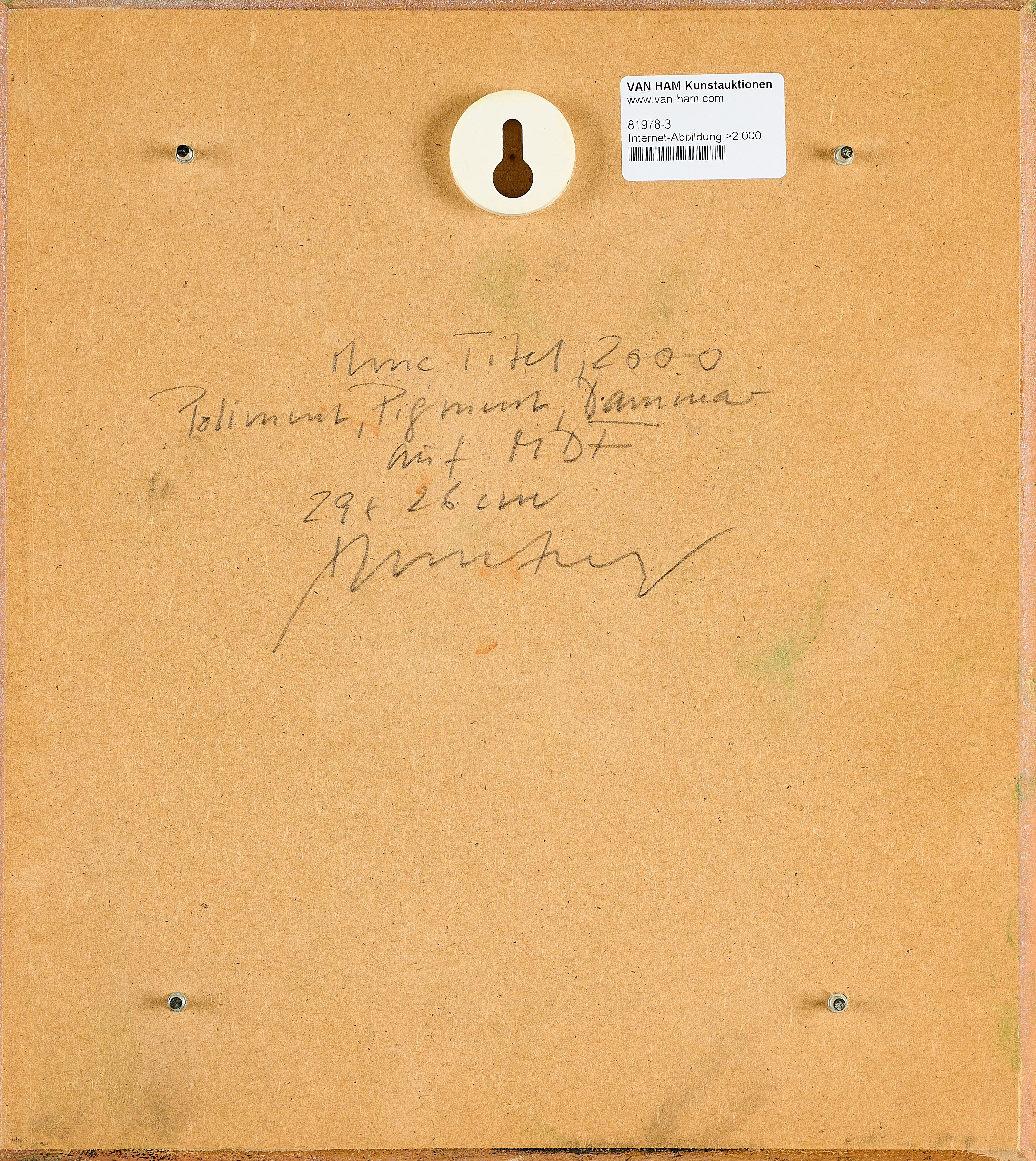 Bezeichnung: Bezeichnet, datiert, bezeichnet und signiert verso: Ohne Titel, 2000 Poliment, Pigment, Dammar auf MDF 29 x 26cm Umberg.
