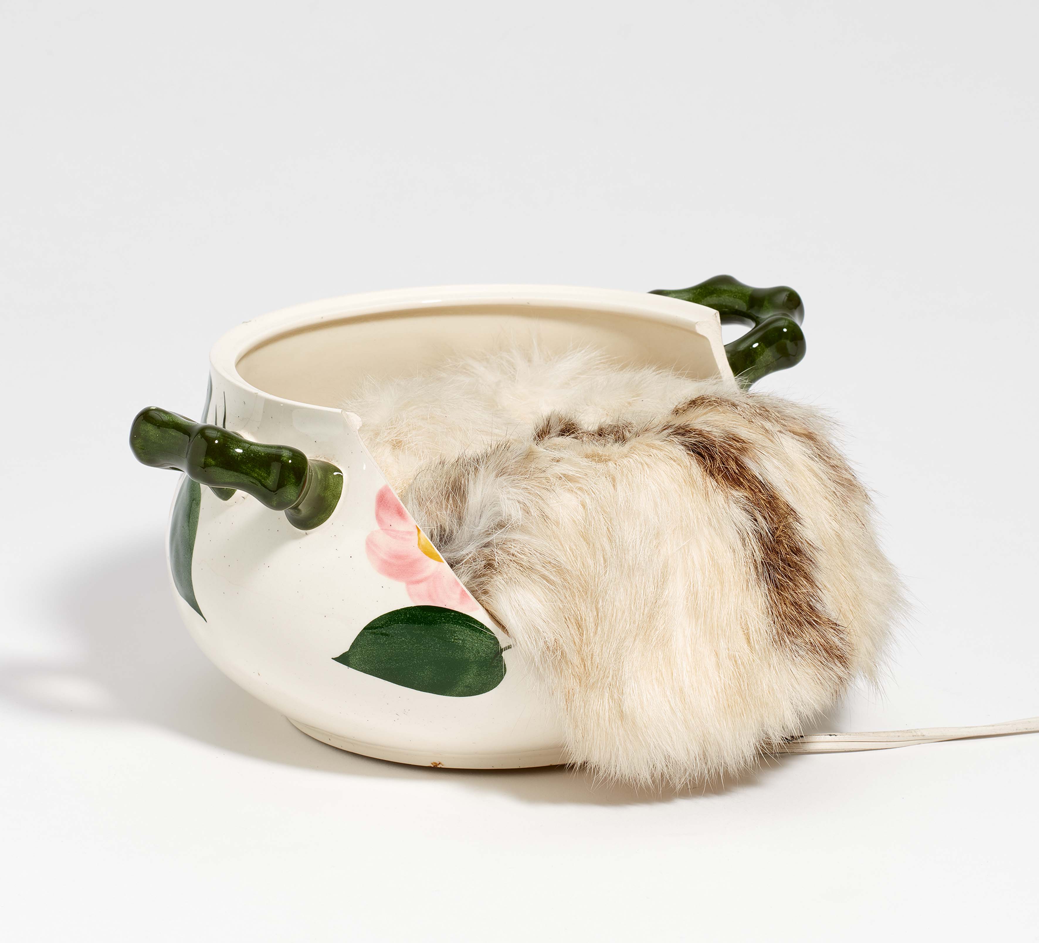Technik: Keramikschüssel (Wildrosendekor) mit Kunstfell.