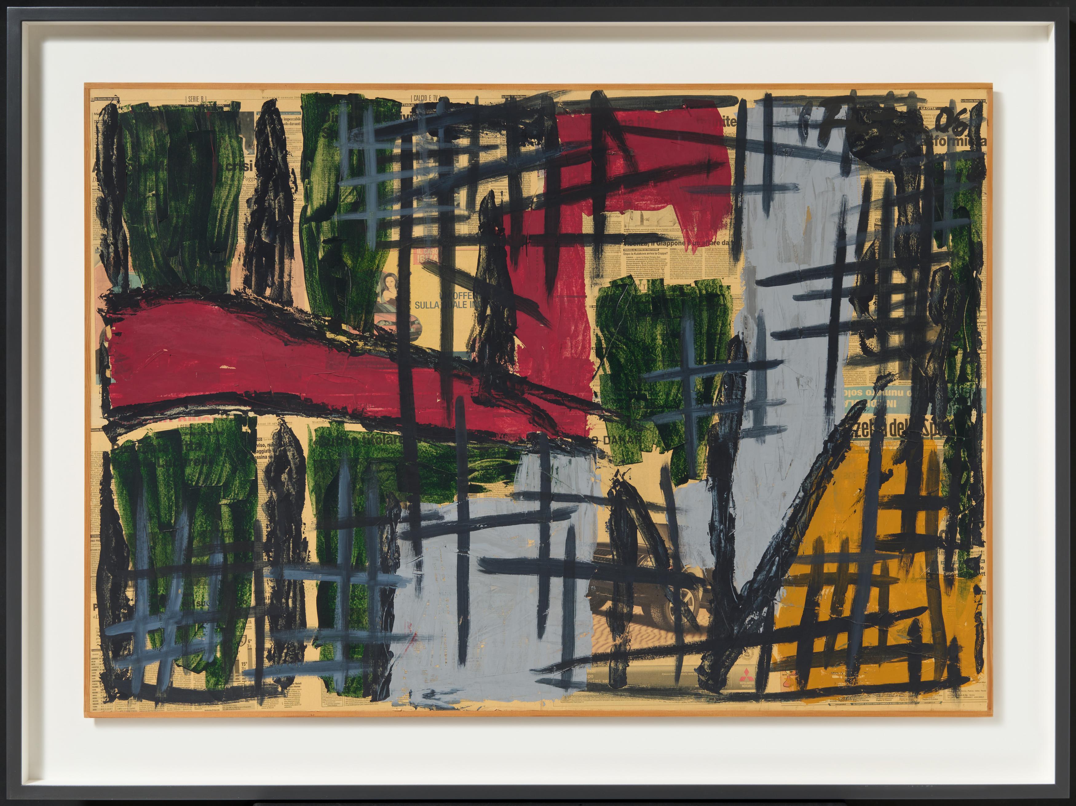 "Gazzetta dello Sport" gehört zu einer Werkserie, in der Günther Förg sein malerisches Vokabular um das Medium Zeitung erweitert. Auf das typische rosafarbene Papier der italienischen Sportzeitung malt Förg mit kräftigen Acrylfarben abstrakte Felder in Rot, Grün, Gelb und Grau, die von expressiven schwarzen Gittern überzogen werden. Die offene Bildfläche lässt das Zeitungsfragment sichtbar und verankert die Malerei in der Alltagskultur. Gleichzeitig werden die Zeitungsinhalte durch Farbe überdeckt und somit unleserlich gemacht. Förg verbindet hier Gestik und Collage und führt seine Auseinandersetzung mit Materialität und Oberfläche fort. Bereits seit den 1990er Jahren experimentiert er mit Zeitungen und Comics als Bildgrund. In der Serie "Gazzetta dello Sport" spiegelt sich seine Faszination für die Verbindung von Populärkultur und abstrakter Form. Das Werk steht exemplarisch für Förgs kontinuierliche Erweiterung des Malereibegriffs.