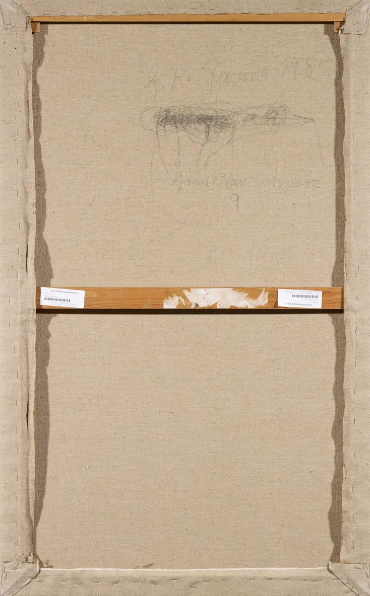 Bezeichnung: Signiert, datiert und betitelt verso: GR. Tuzina 1985, Grün Blau Schwarz. Wort und ein Pfeil mehrfach durchgestrichen.