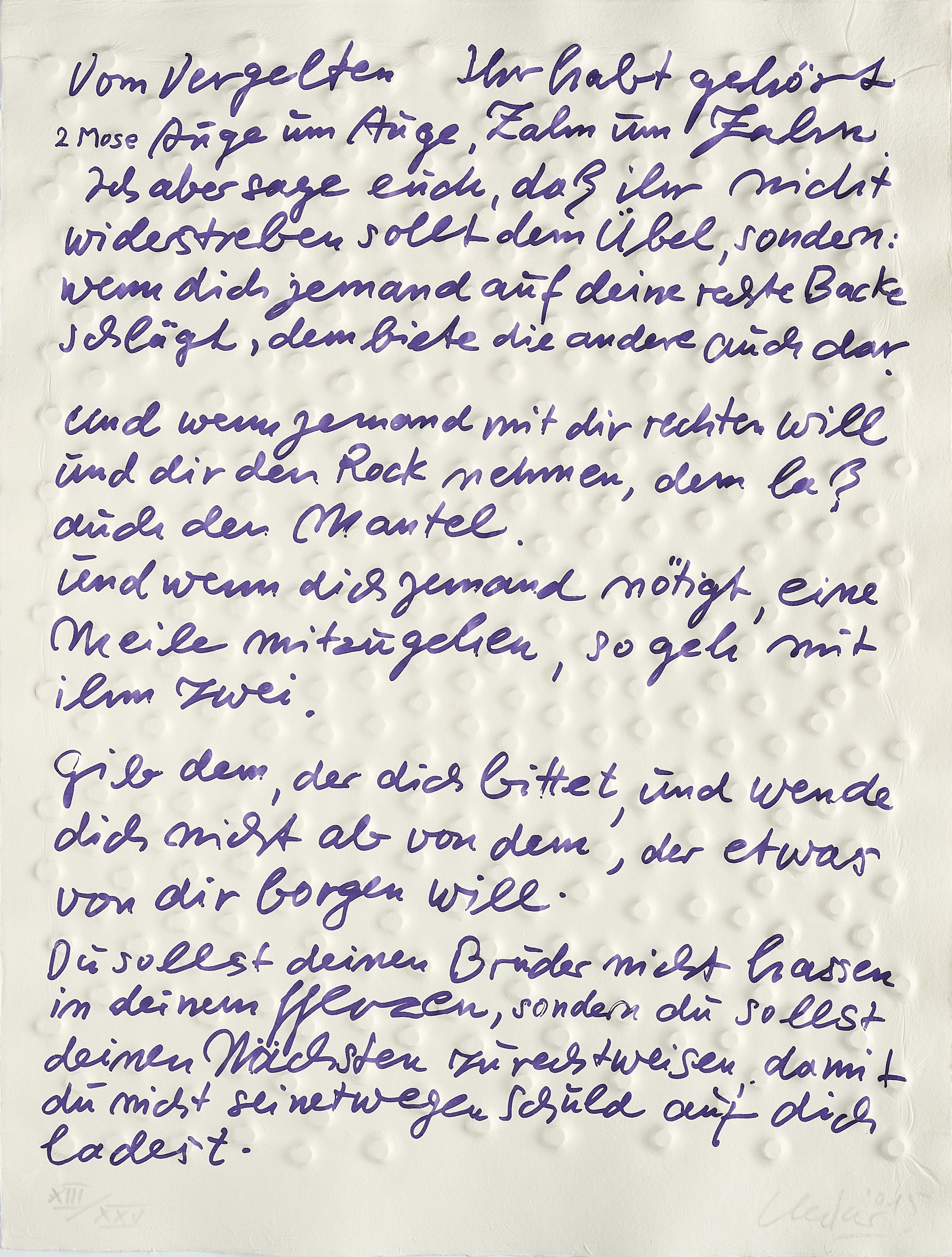 Blatt 7 aus der ursprünglich 9-teiligen Mappe. Aus der Auflage von 100 + XXV Exemplaren. Der Künstler hat hier Textpassagen gewählt aus den Heiligen Schriften der Weltreligionen (hier der Bibel).