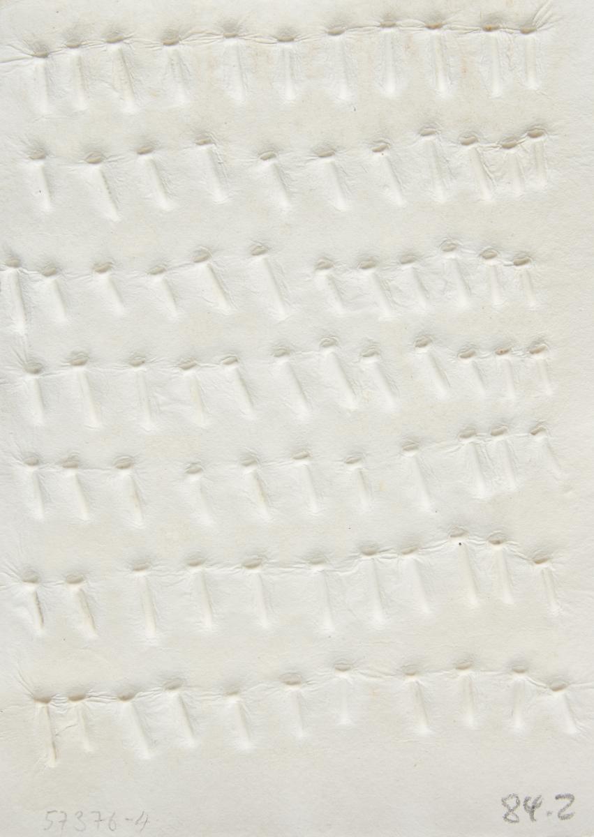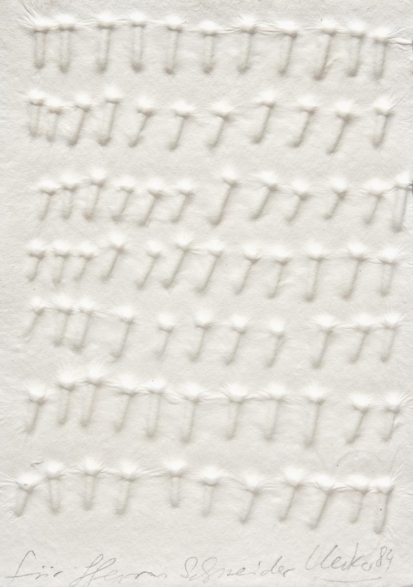 . Prägedruck auf handgeschöpftem Bütten. 19 x 14cm (22,5 x 16cm). Signiert, datiert (84) und gewidmet. Erker Presse, St. Gallen (Hrsg.).