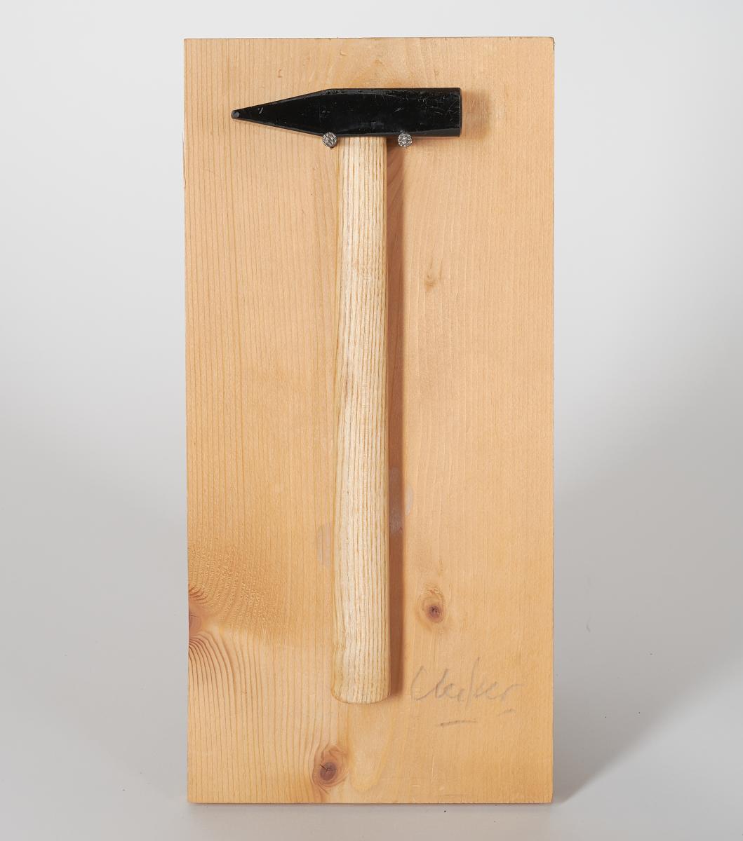 Do it yourself. 1969. Hammer (DIN 1041) und 2 Nägel auf Weichbrettholz, mit Aufhänger. 34 x 16,5 x 7cm. Signiert unten rechts: Uecker.