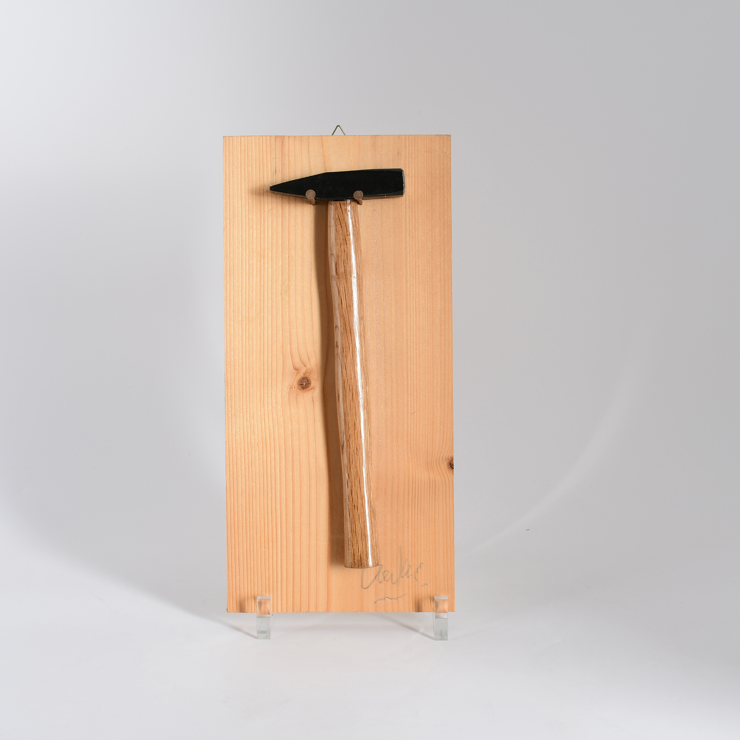 Technik: Hammer (DIN 1041) und 2 Nägel auf Weichbrettholz, mit Aufhänger.