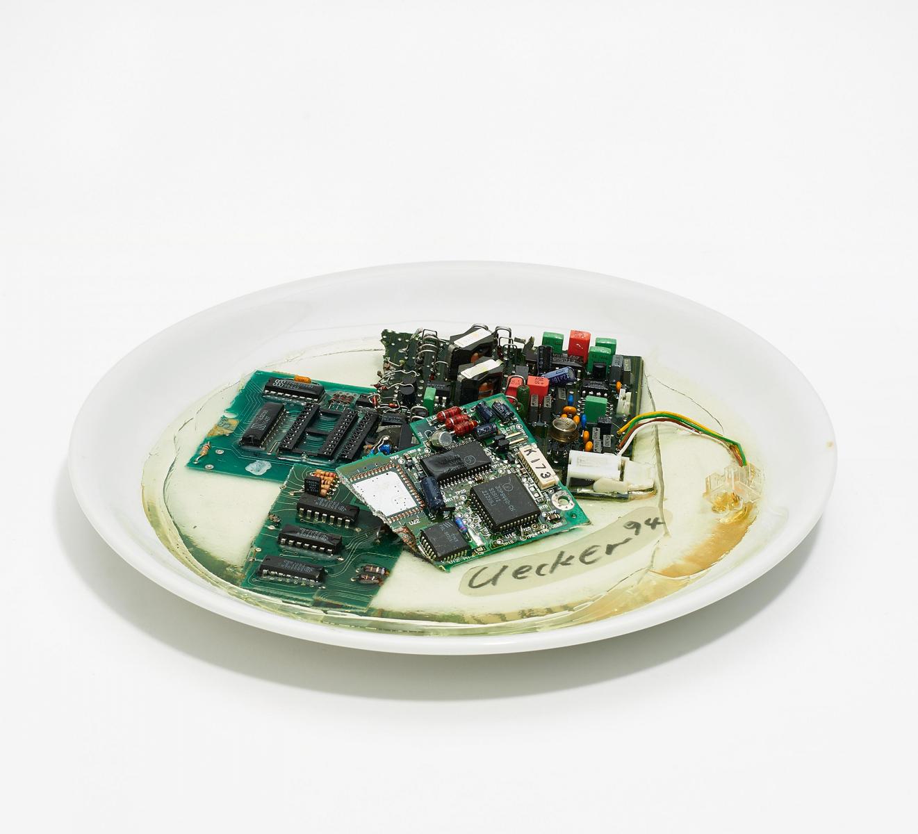 Electronic Salat. 1994. Teller mit in Kunstharz gegossene Elektronikteile. 4 x Ø 24,5cm. Signiert und datiert unter dem Kunstharz: Uecker 94. Auf der Unterseite Etikett mit Angaben zu Titel, Datierung, Künstler und Herausgeber. Westdeutsches Werbefernsehen GmbH, Köln (Hrsg.).
