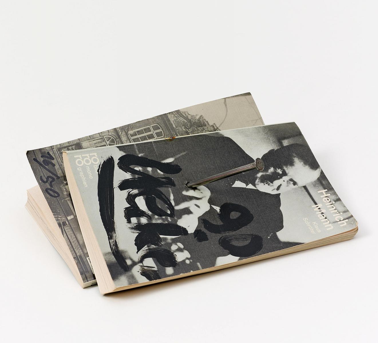 Heinrich und Thomas Mann (Aus einem Haus). 1990. Zwei Taschenbücher, Nagel. Ca. 22 x 15 x 7cm. Dazu die Kopie einer Anleitung des Künstlers für einen Schaukasten. Datiert und signiert auf dem oberen Buchdeckel: 90 Uecker. Nummeriert auf dem unteren Buchdeckel: 16/50. Ex. 16/50.