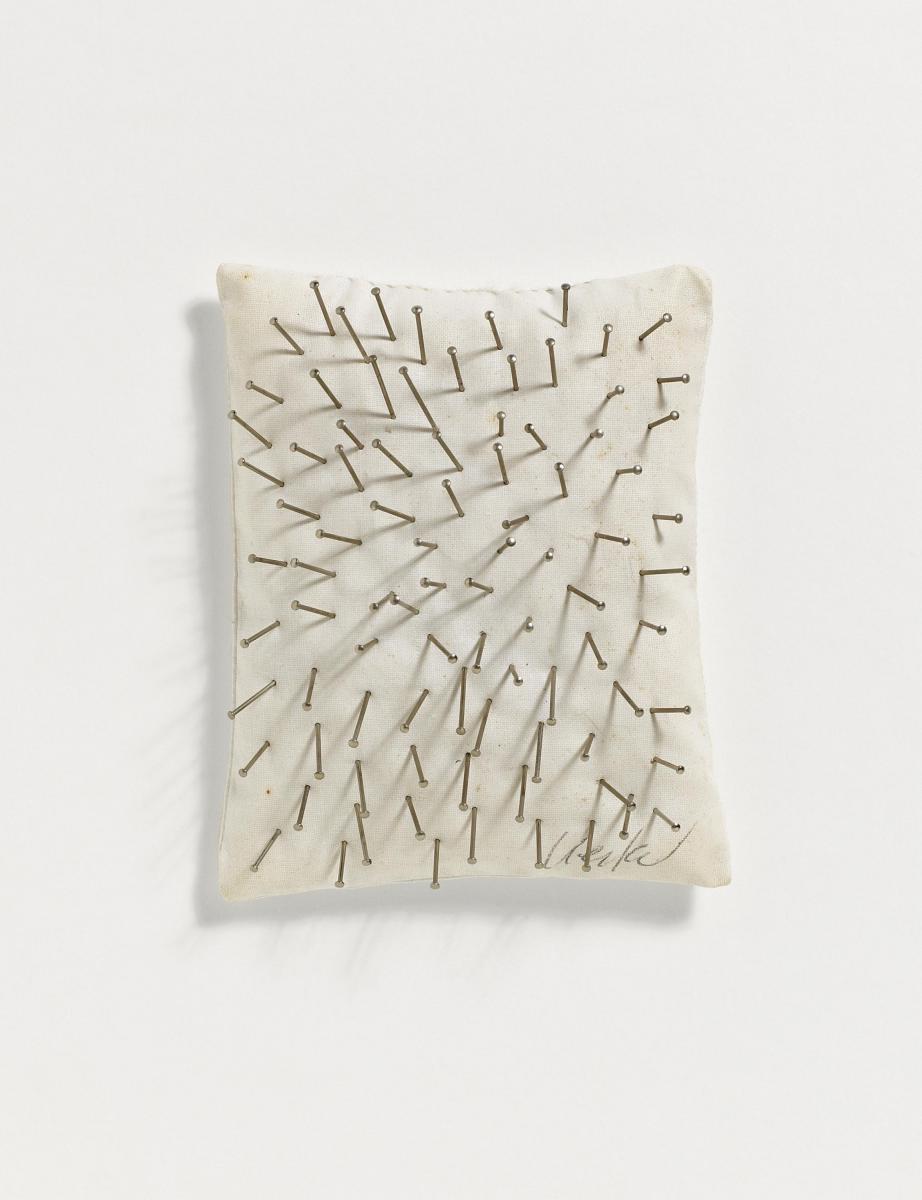 Homage à Achim von Arnim und Clemens von Brentano. 1969. Weißes Kissen, Stecknadeln. 4 x 13,5 x 11cm. Signiert unten rechts: Uecker. Rolf Kuhn Verlag, Olef/Aachen (Hrsg.). Ex. Eines von 200 Exemplaren. Glaskasten.
