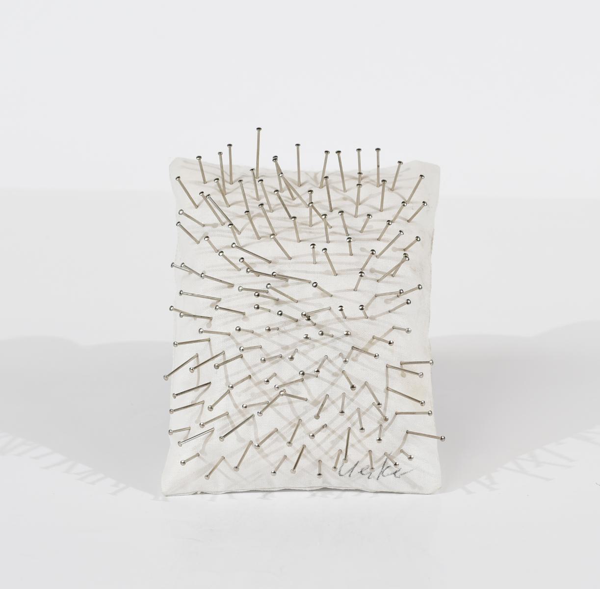 Hommage à Achim von Arnim und Clemens von Brentano. 1969. Weißes Kissen mit Stecknadeln 14 x 10 x ca. 4,5cm. Signiert auf dem Kissen unten rechts: Uecker. Rolf Kuhn Verlag, Olfe/Aachen (Hrsg.).