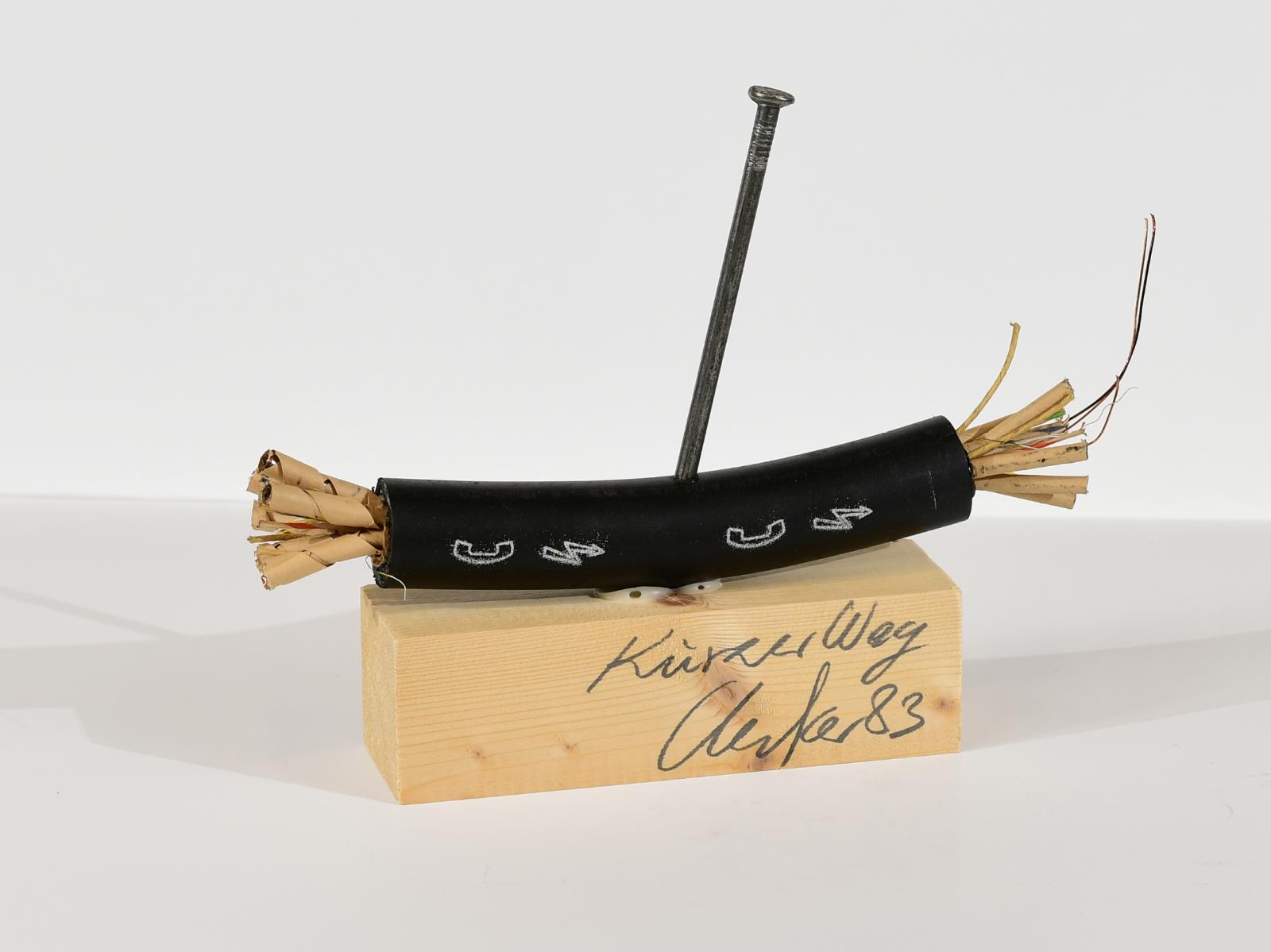 "Kurzer Weg". 1984. Papierumwickelte Kupferkabel in Hartgummischlauch mit Nagel, auf Vierkantholz montiert. 22 x 28 x 5,5cm. Stempelsignatur und datiert auf einer der Längsseiten: Uecker 83. Darüber betitelt.