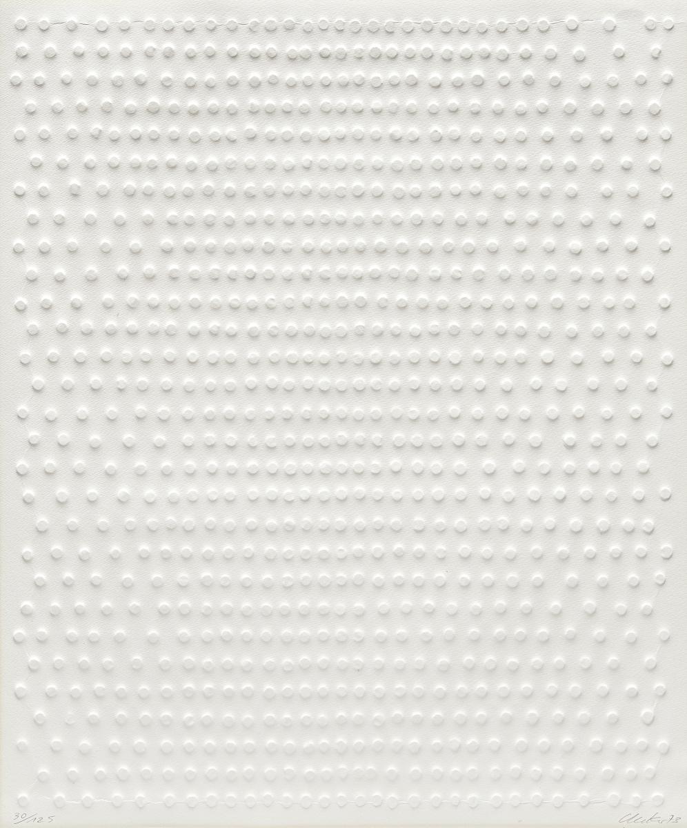 Ohne Titel. 1973. Prägedruck auf Bütten. 56,5 x 47,5cm (60 x 50cm). Signiert, datiert und nummeriert. Ex. 30/125. Rahmen.