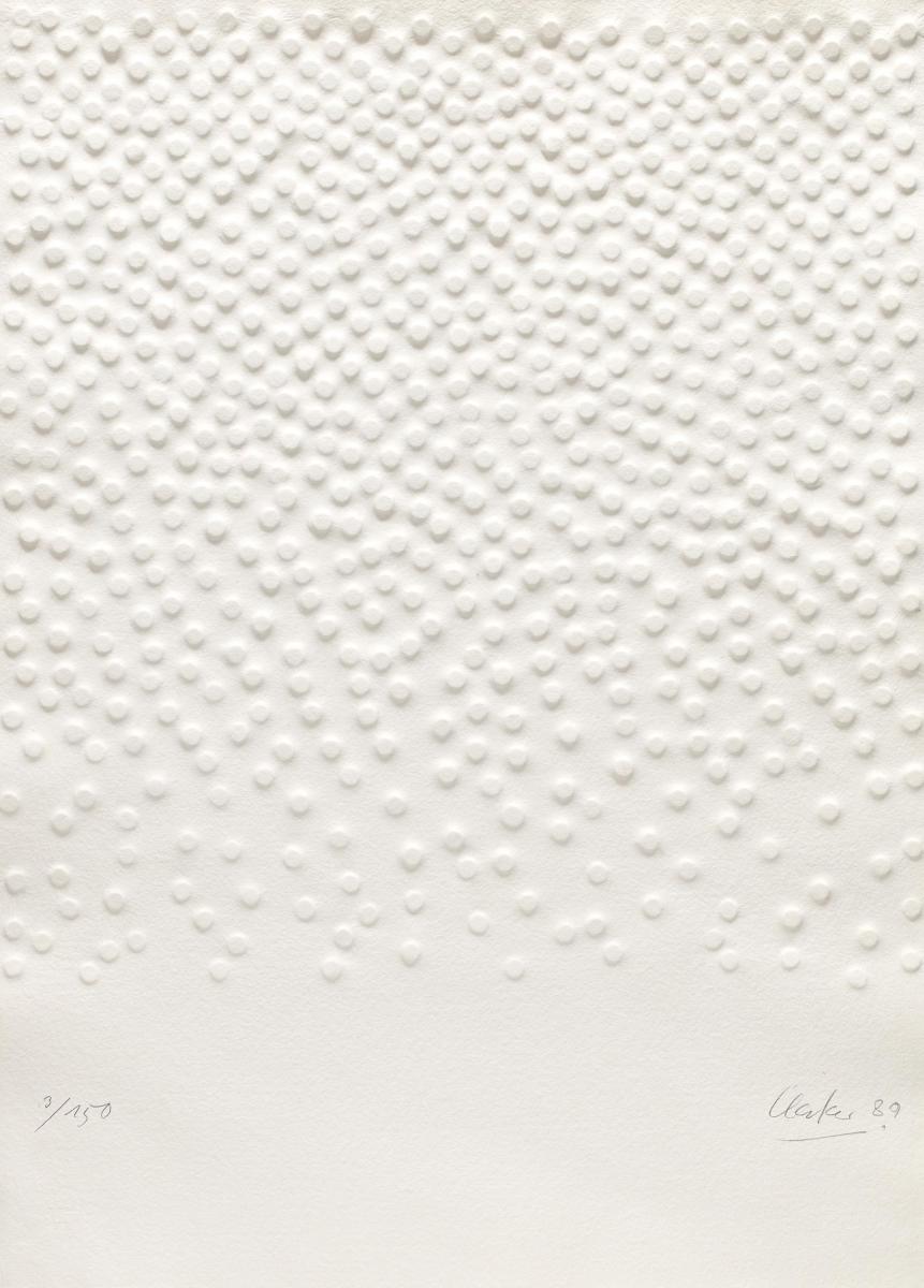 Ohne Titel. 1989. Prägedruck auf handgeschöpftem Bütten. 51,5 x 48,5cm (69,5 x 50cm). Signiert, datiert und nummeriert. Ex. 3/150. - Blatt druckbedingt gewellt. Ansonsten in sehr gutem Zustand.