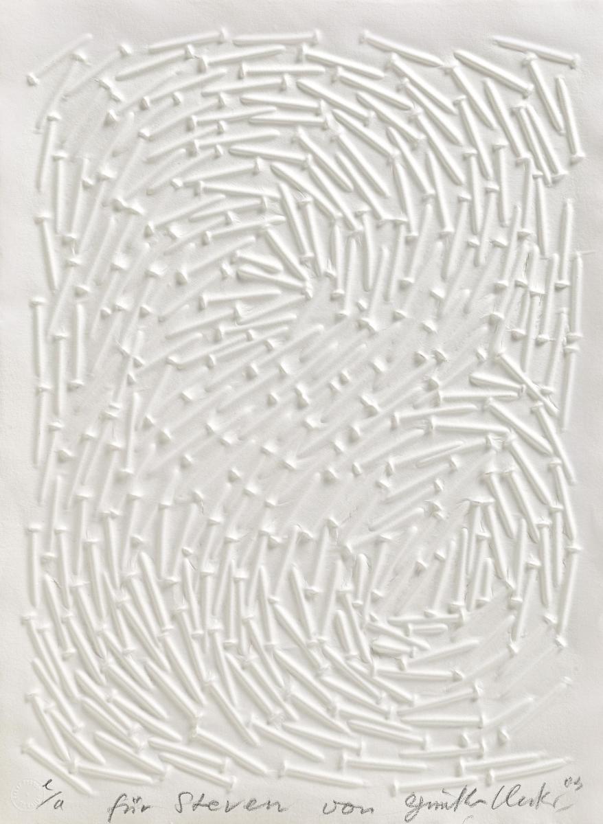 Ohne Titel (Feld, Spiralähnliche Bewegung 2). 2003. Prägedruck auf handgeschöpftem Bütten. 46 x 34cm (50 x 37,5cm). Signiert, datiert, bezeichnet und gewidmet. Erker Presse, St. Gallen (Hrsg.). Ex. e/a. Rahmen. - Blatt druckbedingt gewellt. Verso Reste alter Montierung in den Eckbereichen.