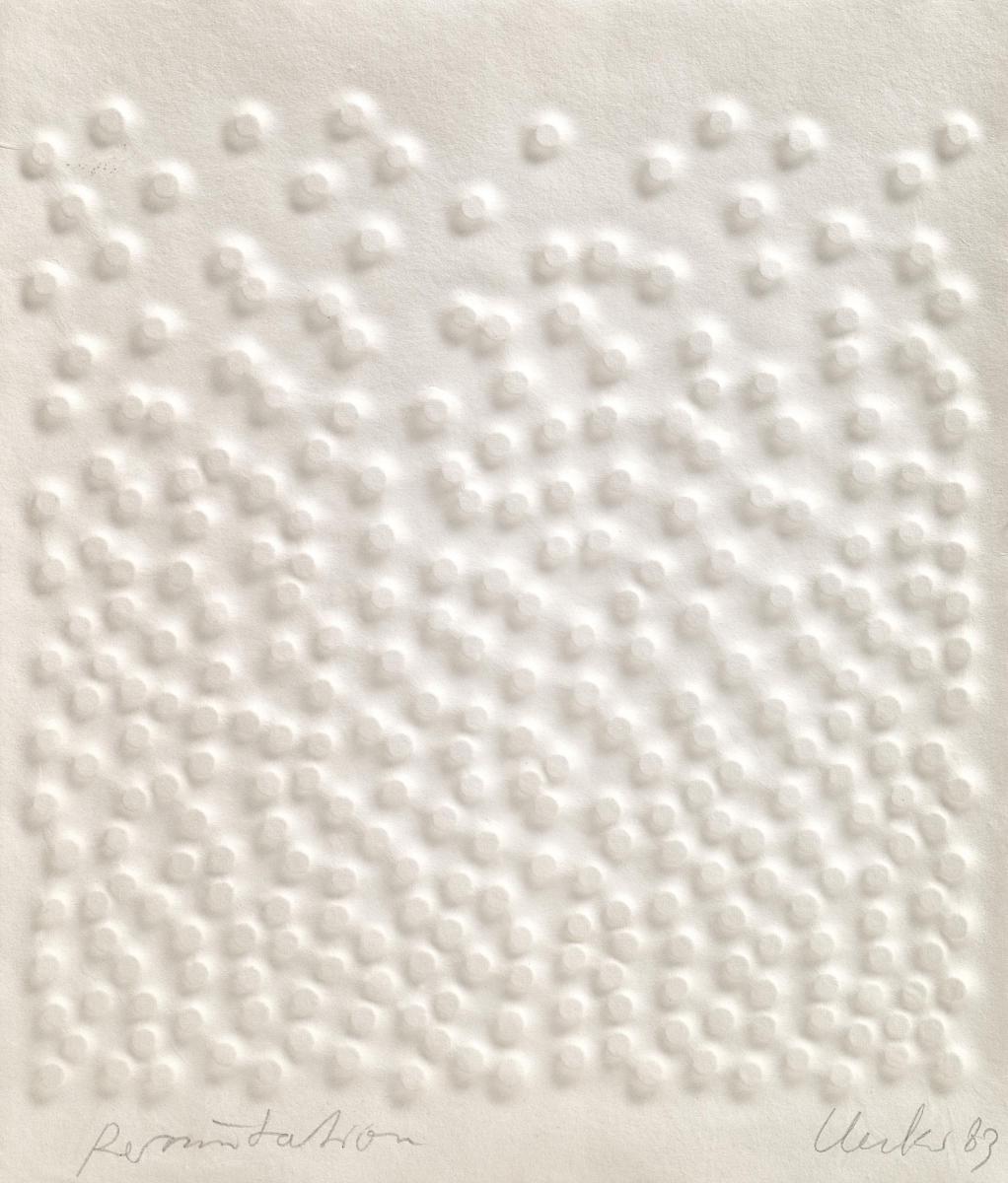 Permutation. 1983. Prägedruck auf handgeschöpftem Bütten. 27 x 25,5cm (33 x 28cm). Signiert, datiert und betitelt. Klett-Cotta Verlag, Stuttgart (Hrsg.). - Blatt gebräunt. Verso Reste alter Montierung im oberen und unteren Blattbereich.
