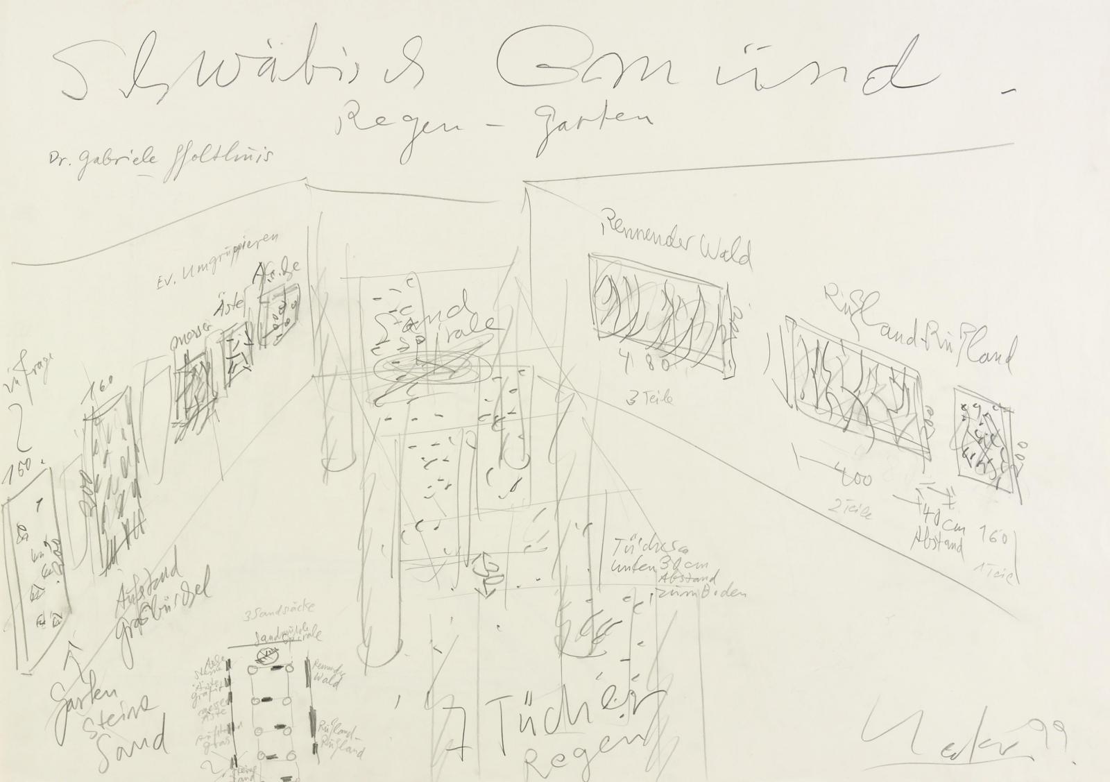 Schwäbisch Gmünd , Regen - Garten. Skizze eines Ausstellungsplans. 1999. Bleistiftzeichnung auf Velin. 61 x 86cm. Signiert und datiert unten rechts: Uecker 99. Rahmen.
