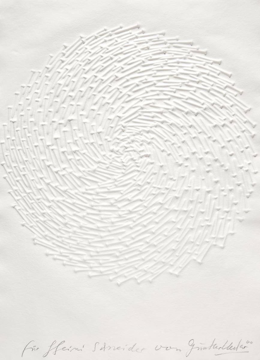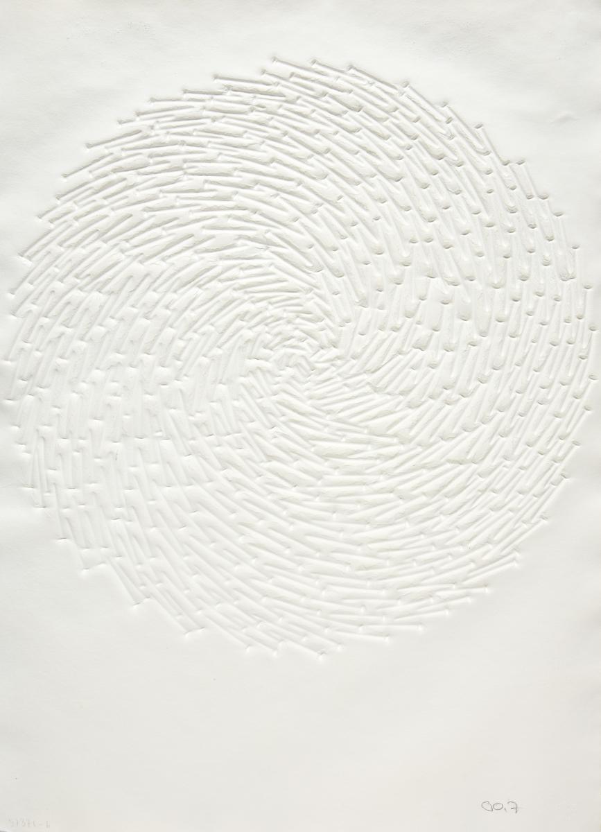 Spirale (1.2000). 2000. Prägedruck auf handgeschöpftem Bütten. Ø 49cm (70 x 50cm). Signiert, datiert und gewidmet. Erker Presse, St. Gallen (Hrsg.).