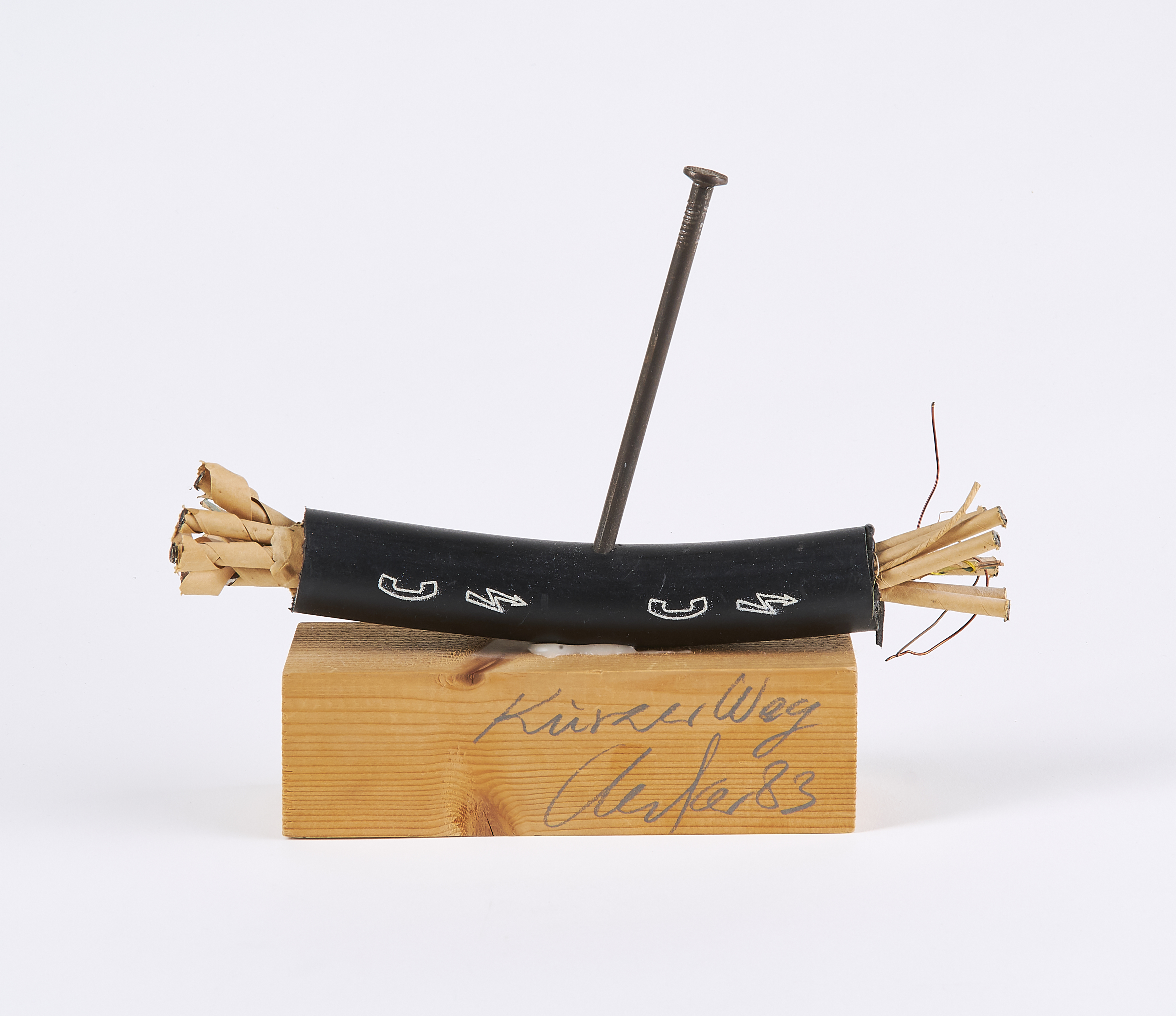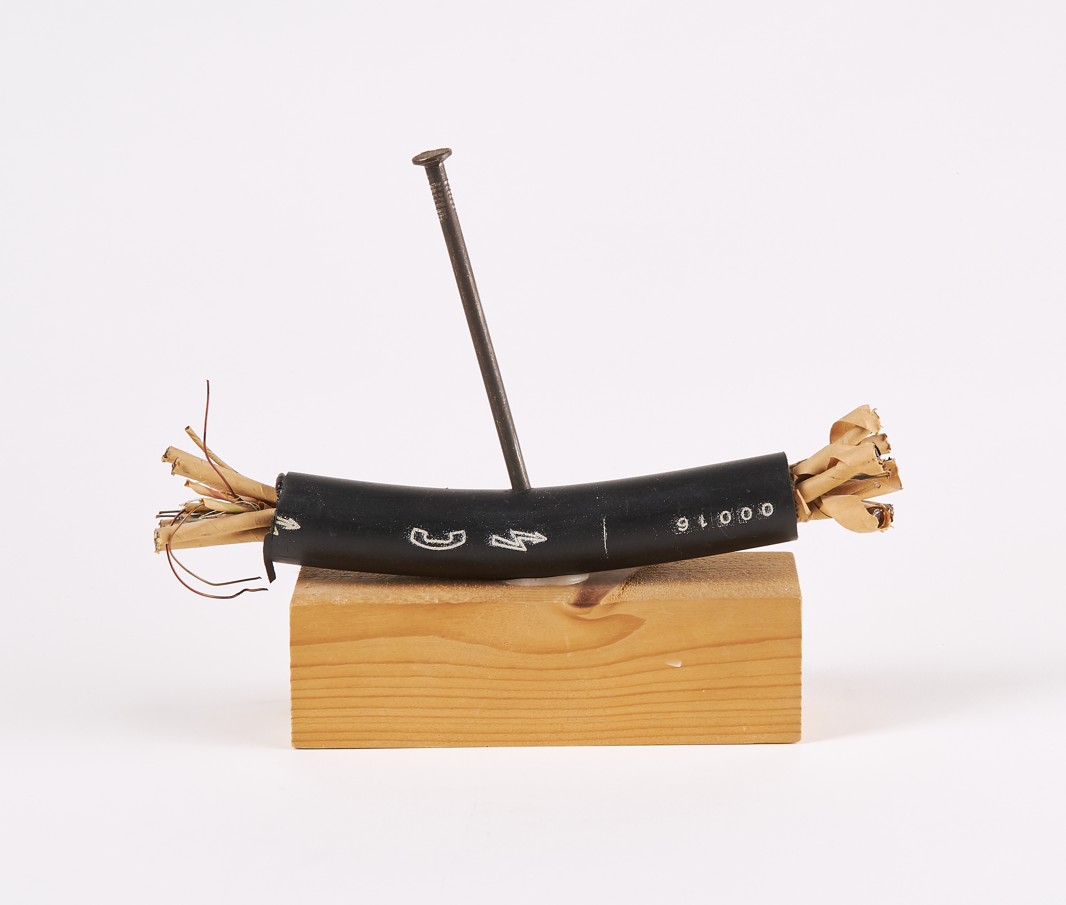 Technik: Papierumwickelte Kupferkabel in Hartgummischlauch mit Nagel, auf Vierkantholz montiert.