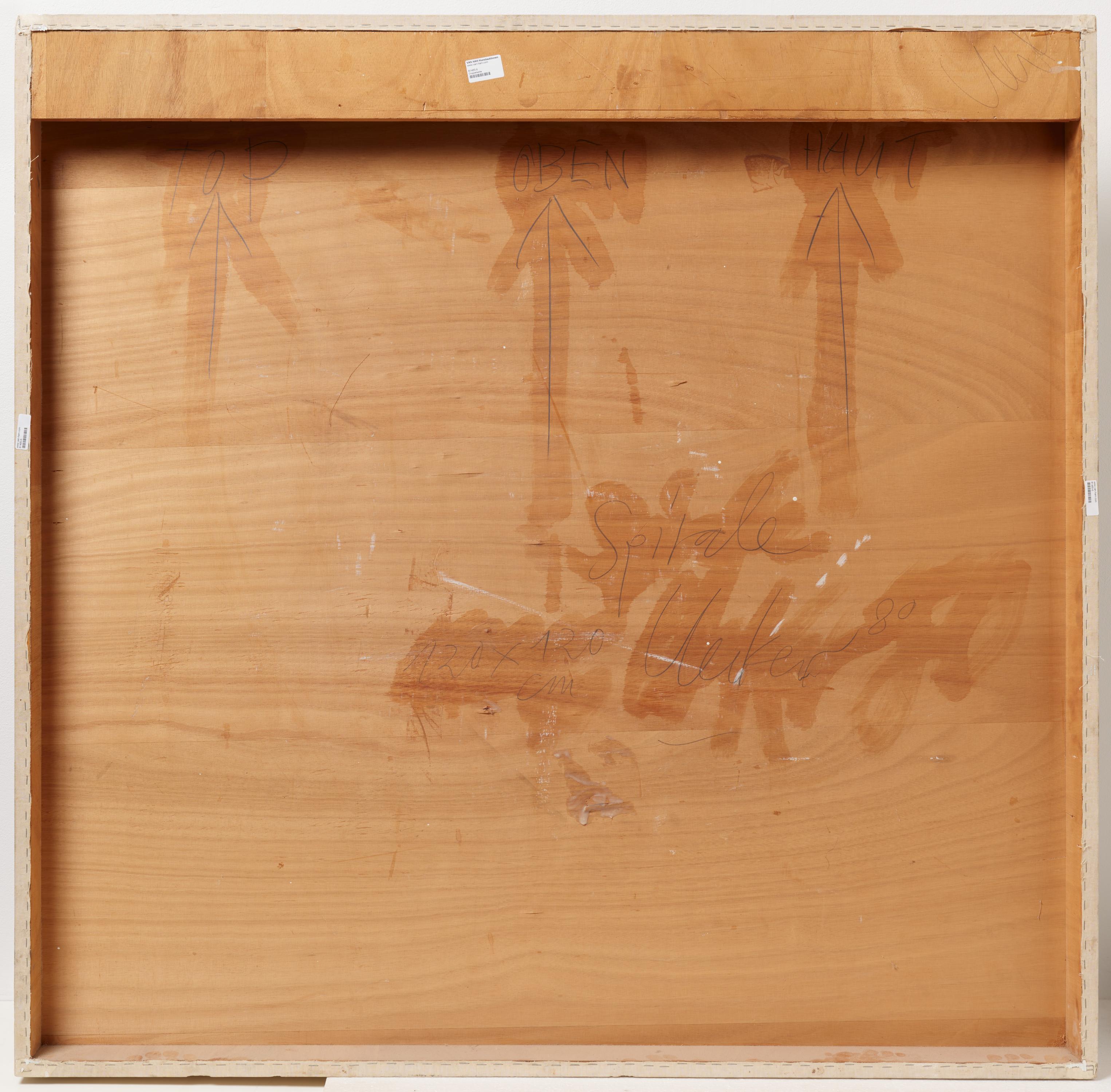 Bezeichnung: Betitelt, signiert und datiert unten: Spirale Uecker 80. Nochmals signiert, datiert und betitelt verso. Hier zudem mit Richtungspfeil und Maßangaben versehen.