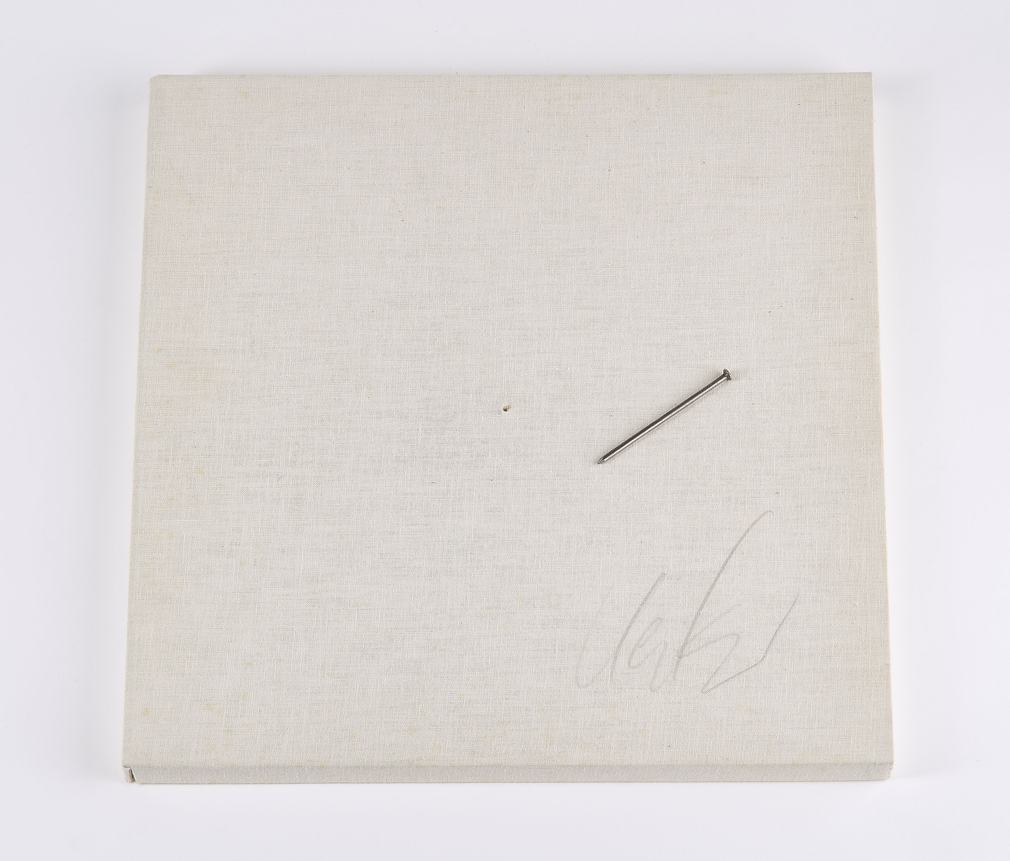 Eines von 30 römisch nummerierten H.C. außerhalb der Auflage von 500 Exemplaren. Auf dem Deckel der Kassette ist eine Vertiefung. In diese muss der Nagel gesteckt werden, der dem Werk im Innern beiliegt.