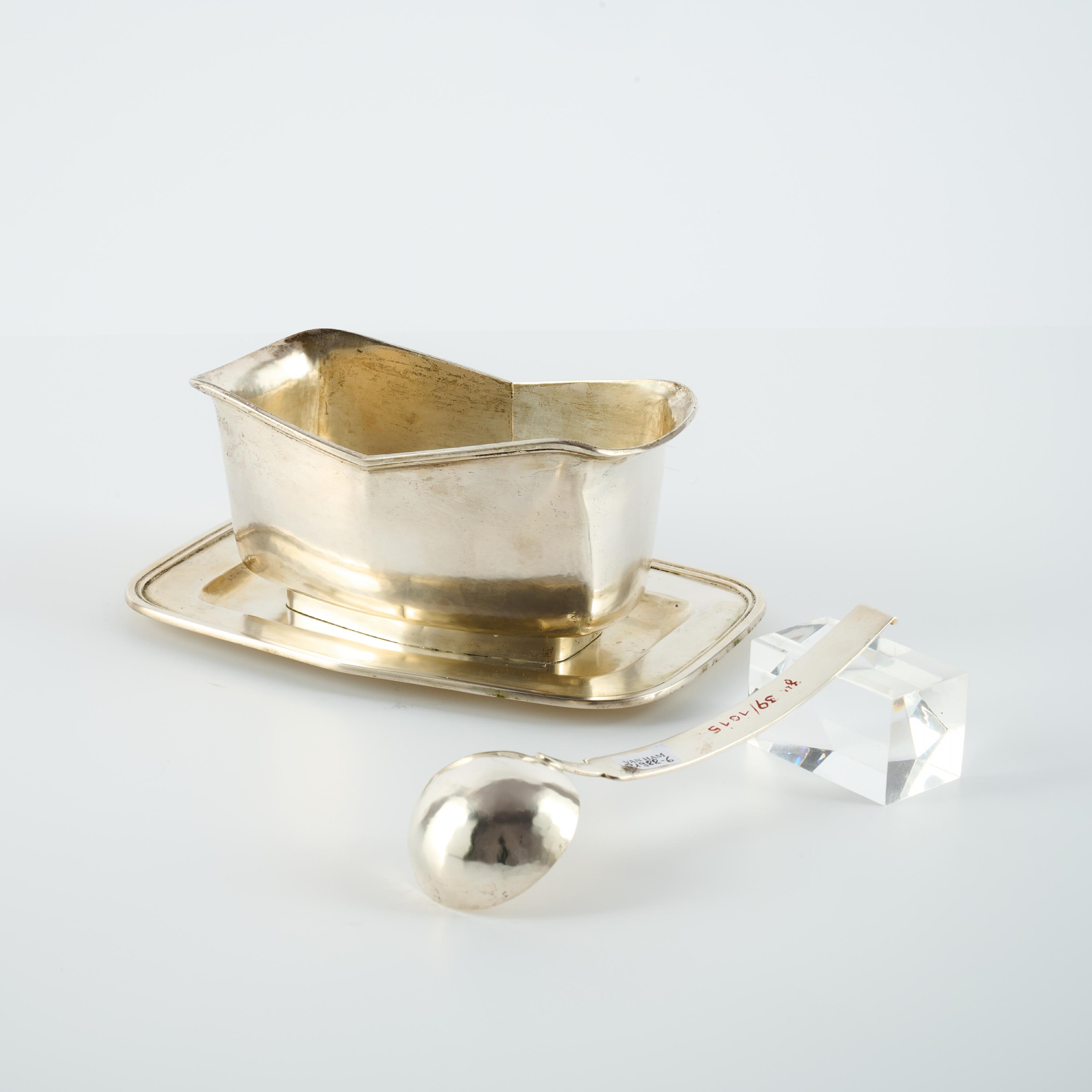 GROßE SAUCIERE AUF FESTEM UNTERSATZ MIT LÖFFEL.