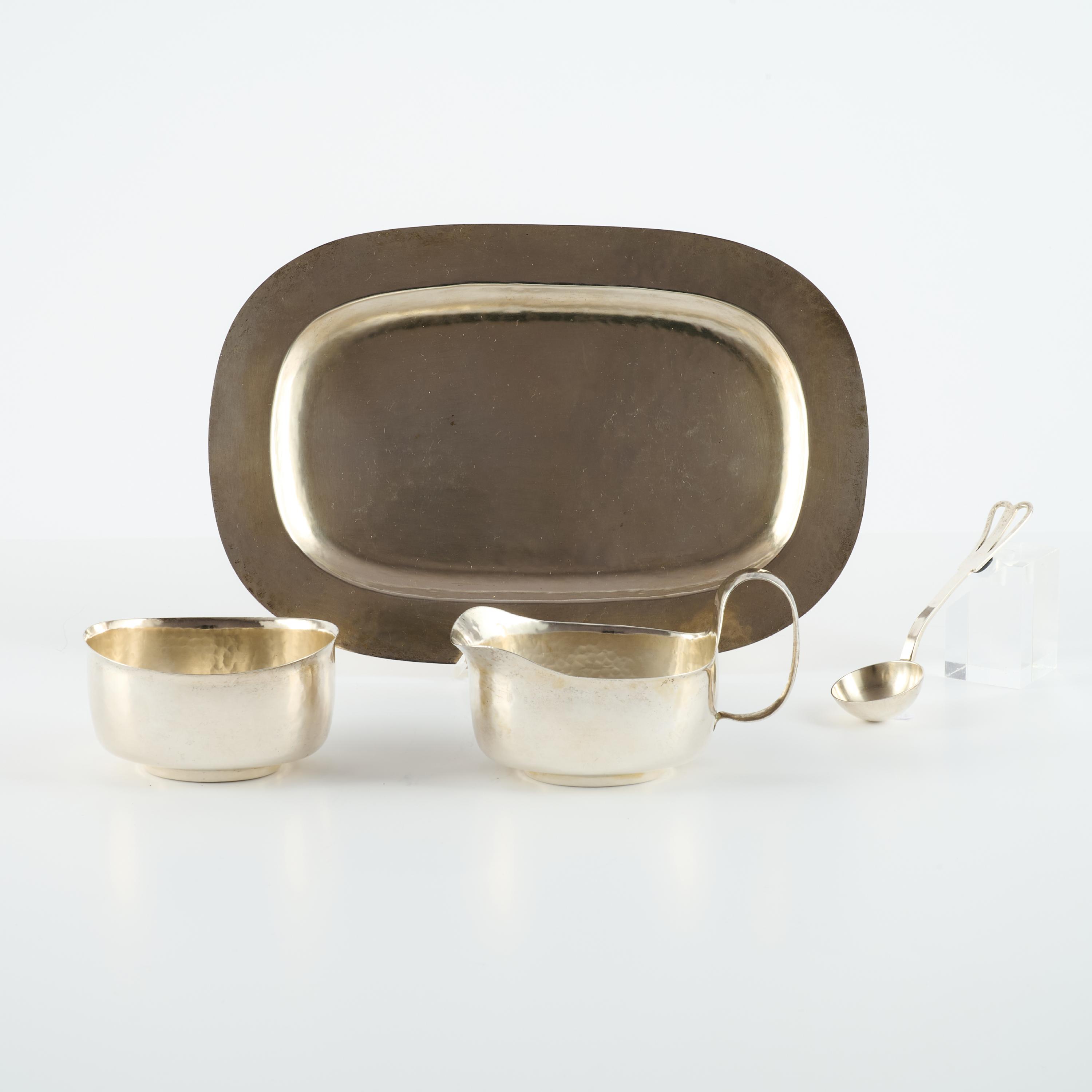 Die Silberobjekte aus der Werkstatt Gumbel & Co., welche Sie auf den folgenden beiden Doppelseiten sehen, entstanden nach Entwürfen des Silberschmieds David Heinz Gumbel. Aus einer Heilbronner Silberschmiedefamilie stammend, ging nach seiner Lehre als Stahlgraveur bei Bruckmann & Söhne, nach Berlin Charlottenburg und besuchte die dortige Kunstgewerbeschule. Zwischen weiteren Ausbildungsstationen, unter anderem in Stockholm, kehrte er immer wieder nach Heilbronn zurück um in der - inzwischen von seinem Vater mitgegründeten - Firma A. Mogler & Cie. und später Gumbel & Co. zu arbeiten. Er emigrierte im Juli 1936 nach Jerusalem und hatte kurz nach seiner Ankunft bereits eine Anstellung in der Werkstatt der berühmten Silberschmiedin Emmy Roth. Wiederum einige Monate später wurde er als Lehrer an die New Bezalel Schule berufen, wo er die kommenden Jahrzehnte unterrichten sollte und so eine ganze Generation von Silberschmieden prägte. Neben seiner Tätigkeit als Lehrer wurde er aber auch aufgrund seiner Entwürfe sehr geschätzt und führte immer wieder Arbeiten im Auftrag des Staates aus. So wie beispielsweise im Jahr 1950 die Hülle für die Unabhängigkeitserklärung des Staates Israel. In seinen Entwürfen findet man nicht nur Einflüsse des Werkbunds, wie er sie bereits bei Bruckmann und in seiner Zeit in Berlin kennengelernt hatte. Auch die Gedanken aus dem Bauhaus scheinen seine Entwürfe beeinflusst zu haben.